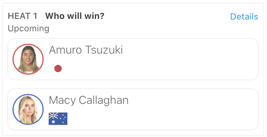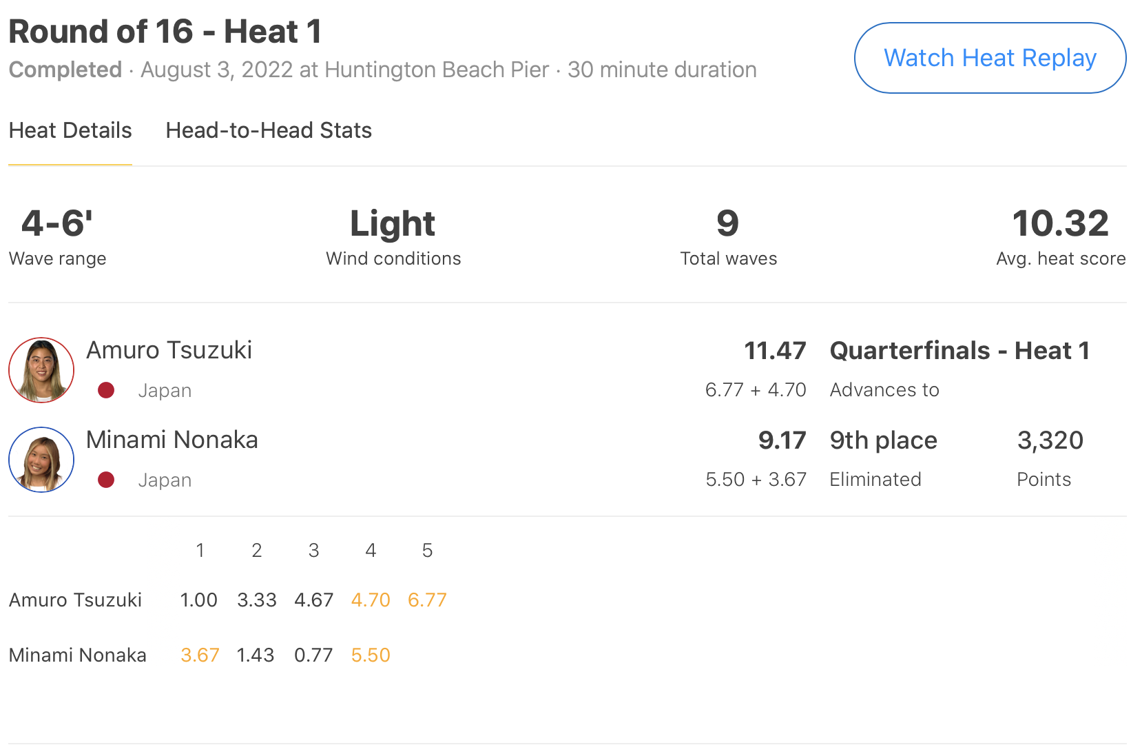 ヒート1では都筑有夢路と野中美波といった日本人選手同士の対戦。