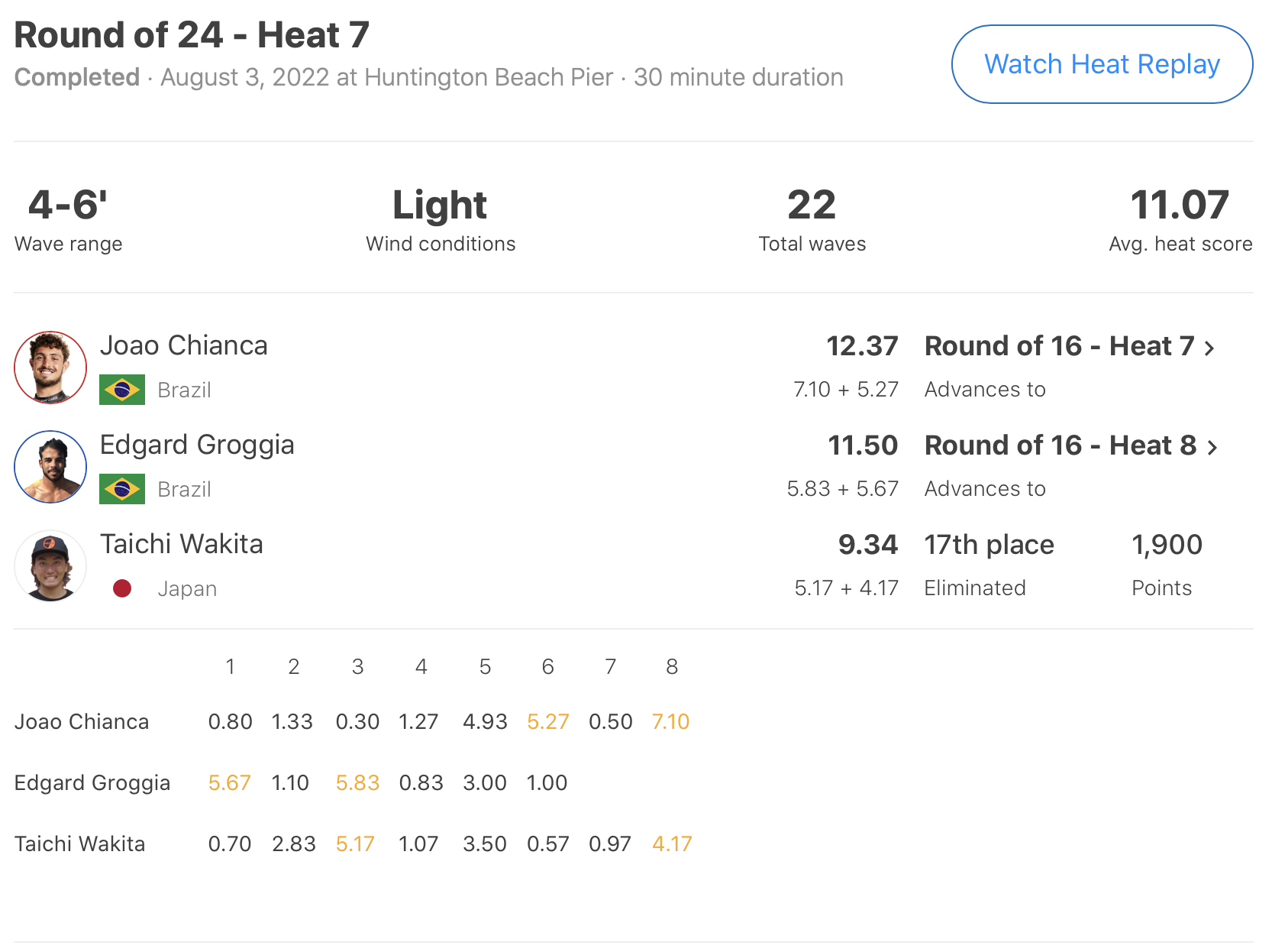 しかし、後半に入るとJoao Chiancaが5.27pt、さらに7.10ptというこのヒートのハイエストスコアを叩き出して1位へ。