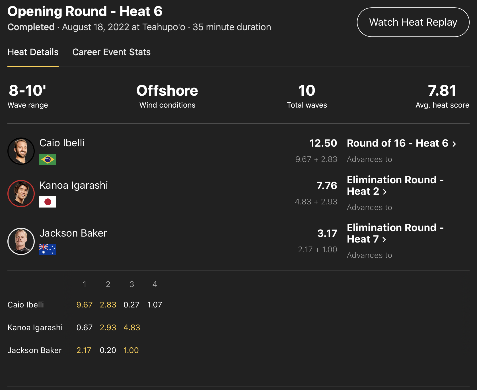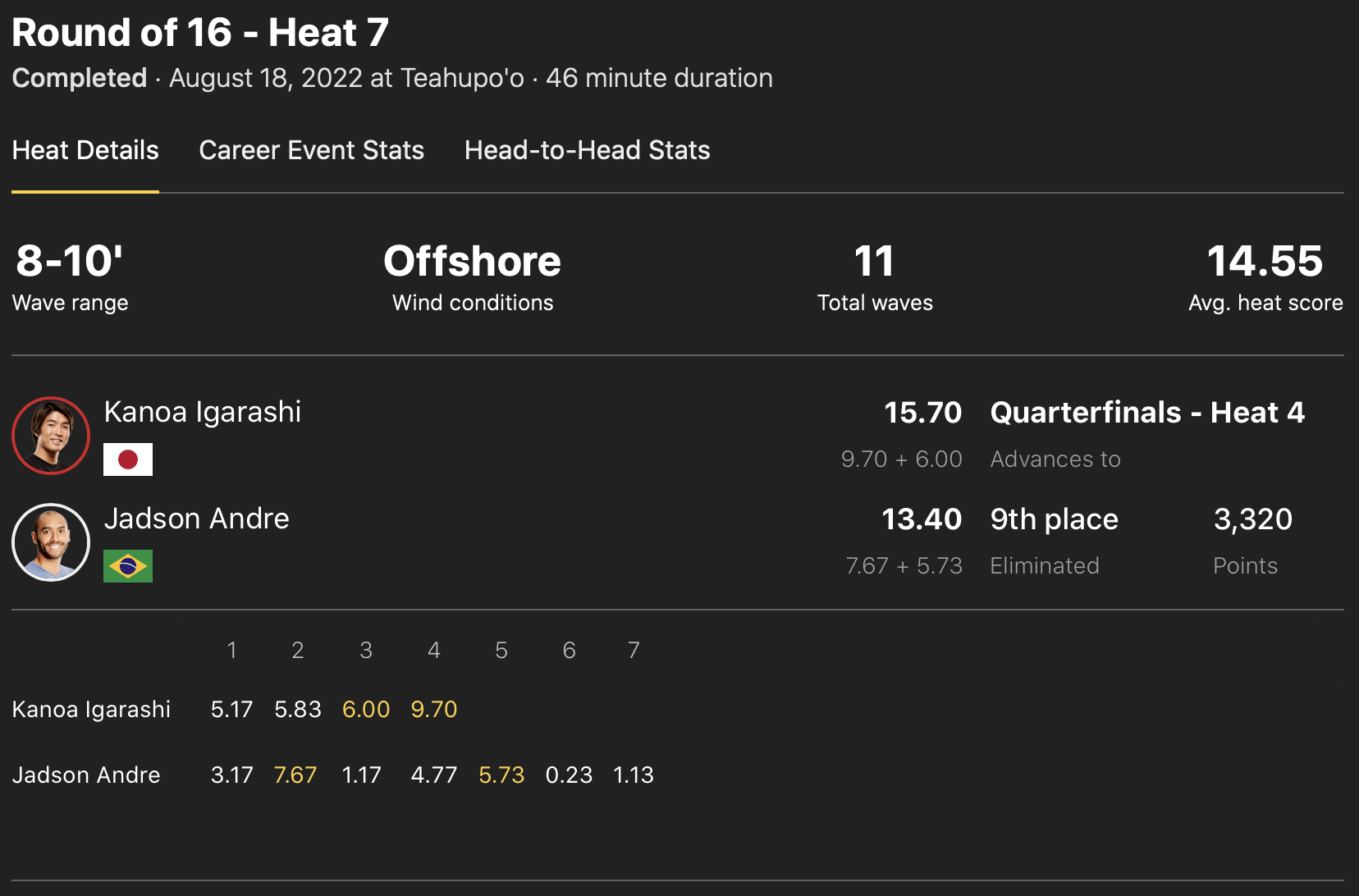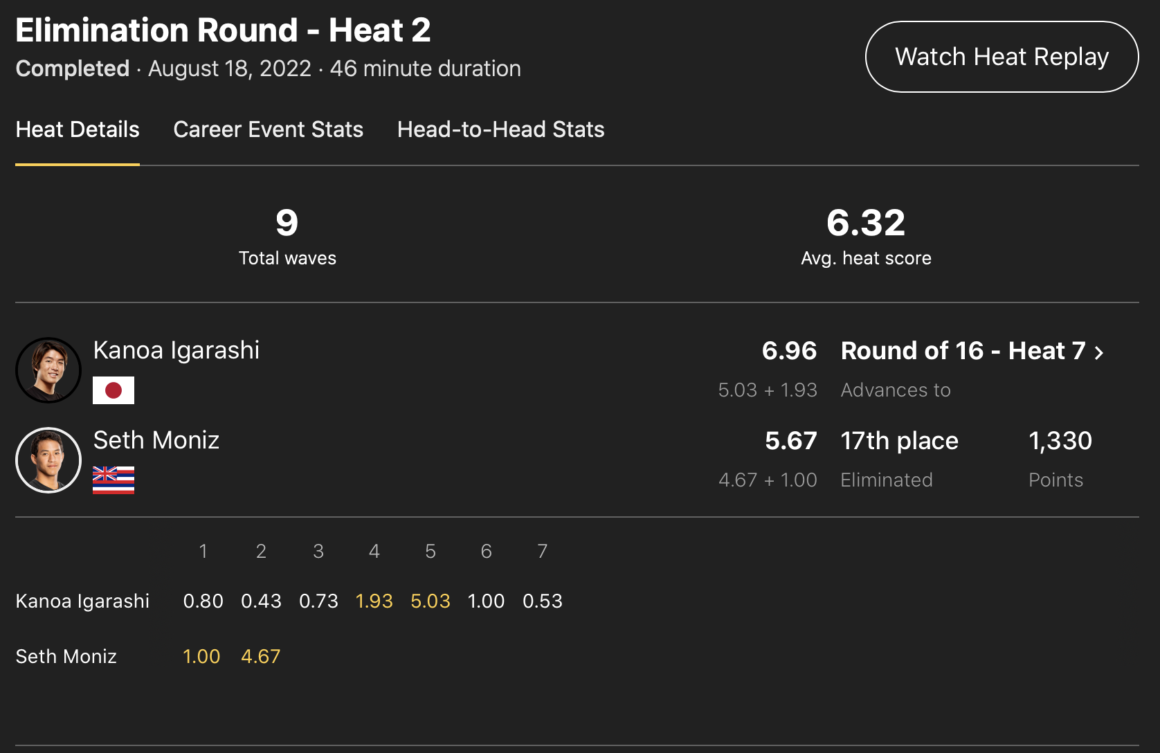 CTランキング6位のポジションでワールドチャンプ決定戦”WSL FINAL”出場権の最低条件であるCTランキング5位入りを賭けて本ビッグイベントに挑む注目の五十嵐カノアは、オープニングラウンドで2位となって敗者復活戦であるイリミネーション・ラウンドのヒート2でSeth Monizに勝利し、迎えるラウンドオブ16のヒート7ではJadson Andreと対戦。