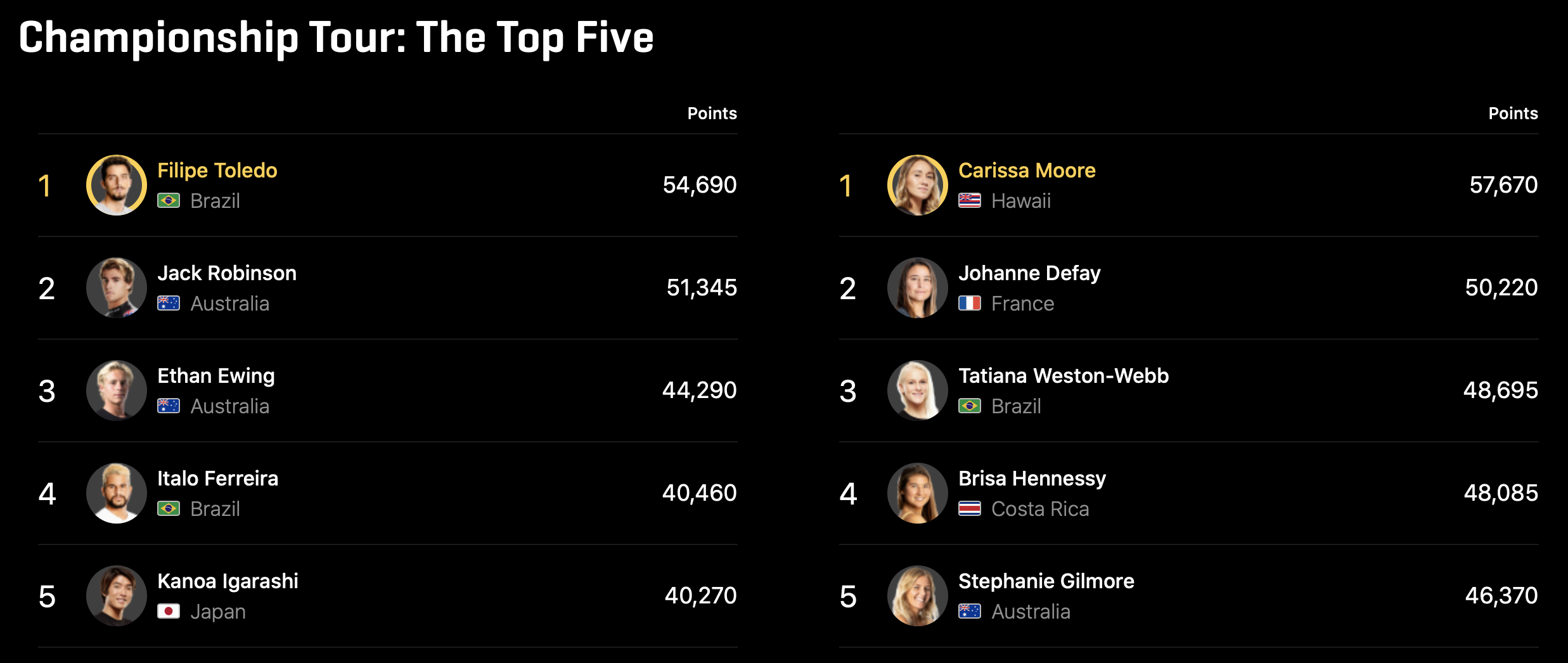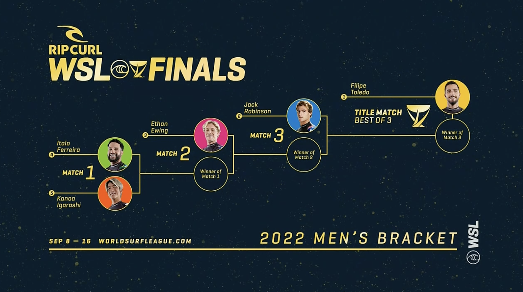五十嵐カノアがワールドチャンプに輝くためには、1回戦目でItalo Ferreiraを、2回戦目でEthan Ewingを、3回戦目でJack Robinsonを、そしてファイナルとなる4回戦目ではFilipe Toledoに勝利しなくてはならない。