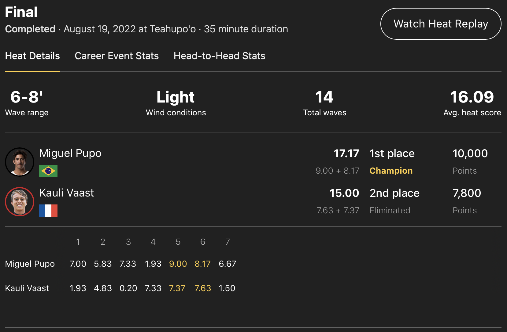 ここで勢いを得たMiguel Pupoは水を得た魚の如くセミファイナルでは Caio Ibelliを、ファイナルではワイルドカードで出場したダークホース、Kauli Vaastを粉砕してMENS優勝を勝ち獲った!