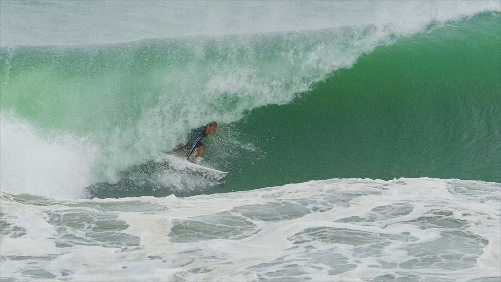 ソリッドに切り立つ波のボトムからパドルを漕ぎ始め、リップがチューブの屋根状態となり始めたタイミングでボードの上に立ち上がり、そのまま垂直に近い壁となったチューブの中のハイラインにレールをセットしてグラブレールの体勢を整えてディープチューブに雪崩れ込んで身を潜めるという、まさにプロサーファーであっても本当に一握りしかできないこの難易度の高いテイクオフ。