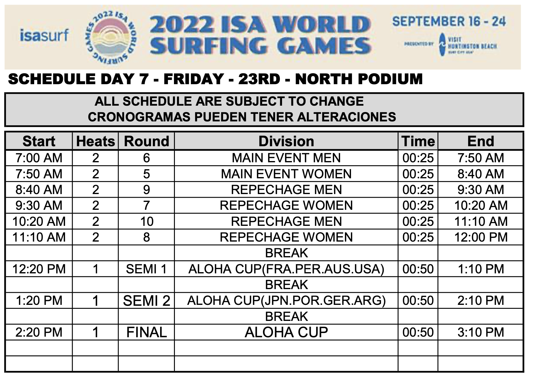 迎えるコンテストDAY7は五十嵐カノアが登場予定のMENSメインラウンド7からスタートとなり、WOMENSメインラウンド5を消化したのちに村上舜が出場予定のリパチャージラウンド9、続いてWOMENSリパチャージラウンド7終了後にMENSリパチャージラウンド10、WOMENSリパチャージラウンド8が行われる予定。