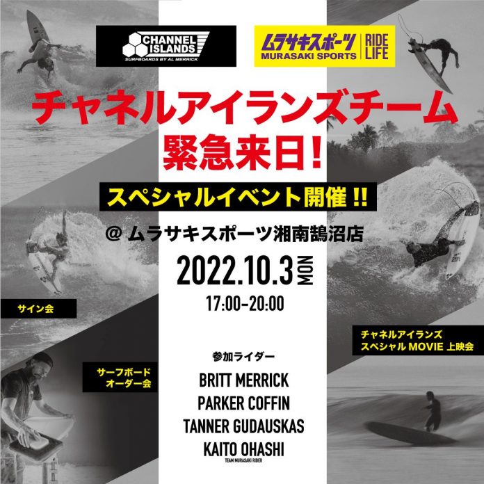 来たる10/3(月)の17:00から20:00までのスケジュールで、ムラサキスポーツ鵠沼店に世界中のトッププロたちから絶大なる信頼を寄せられるCI surfboardsのシェイパーBritt MerrickをはじめチームライダーのParker Coffin、Tanner Gudauskas、大橋海人が来場!