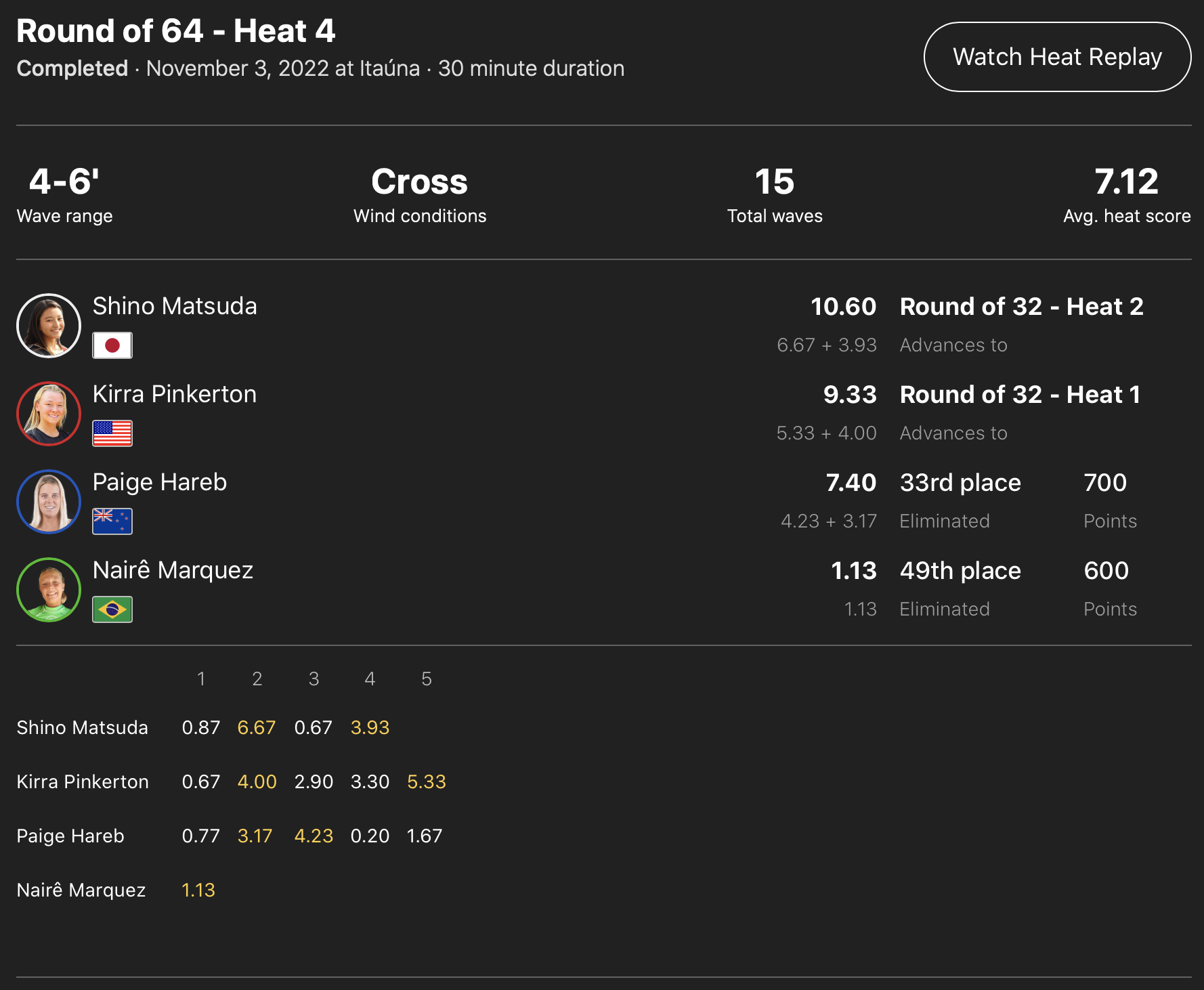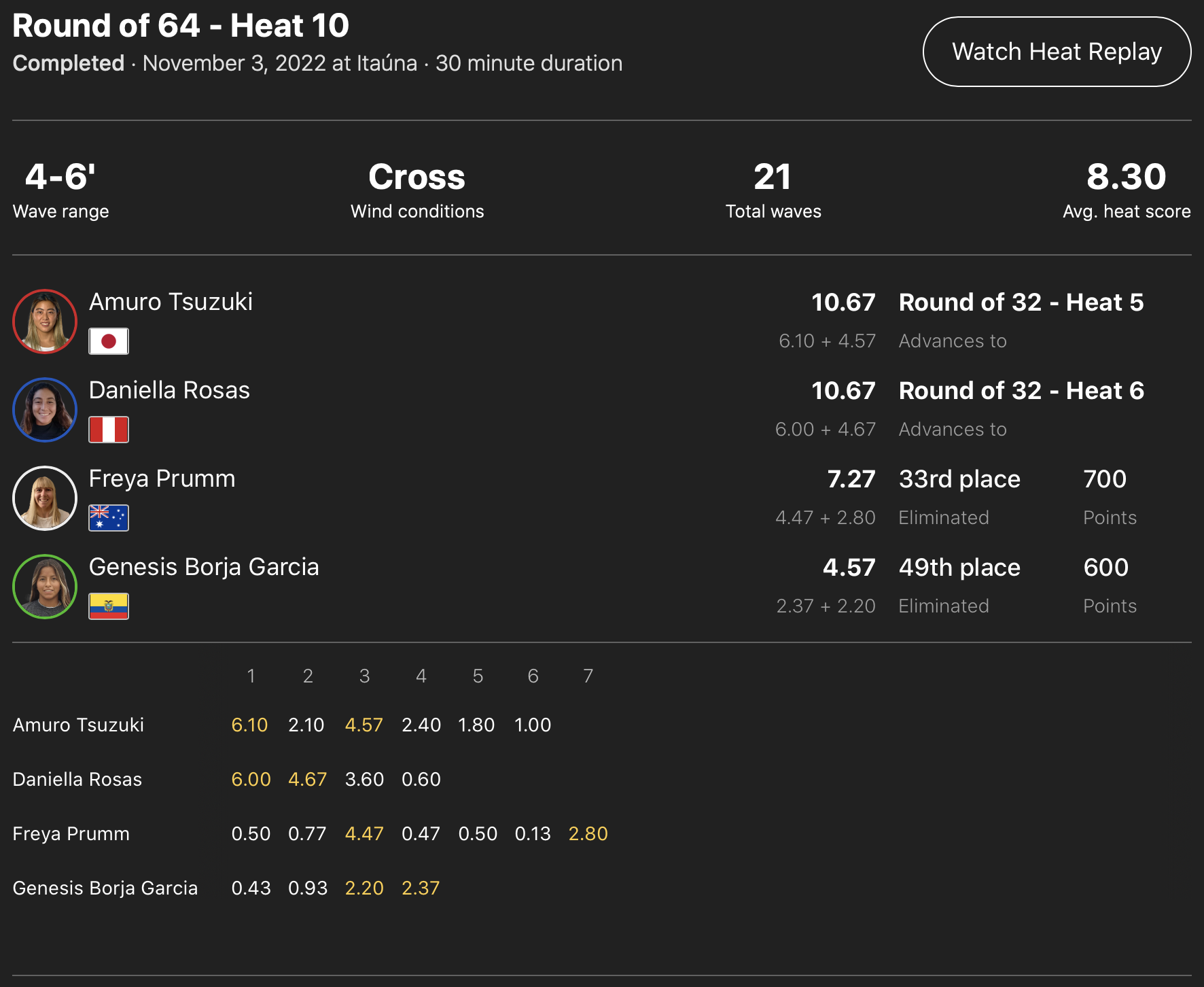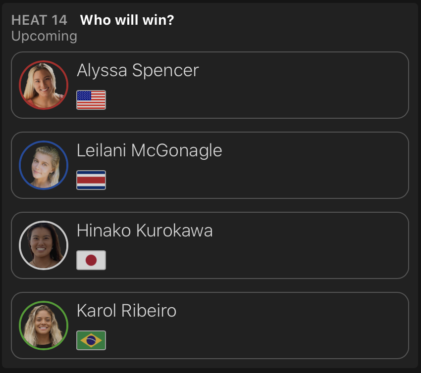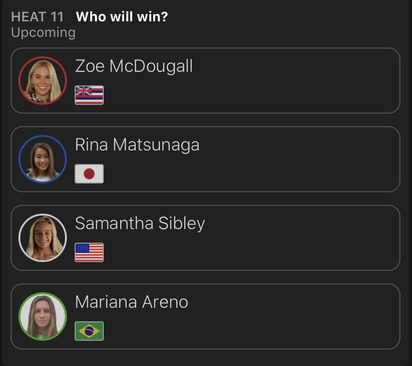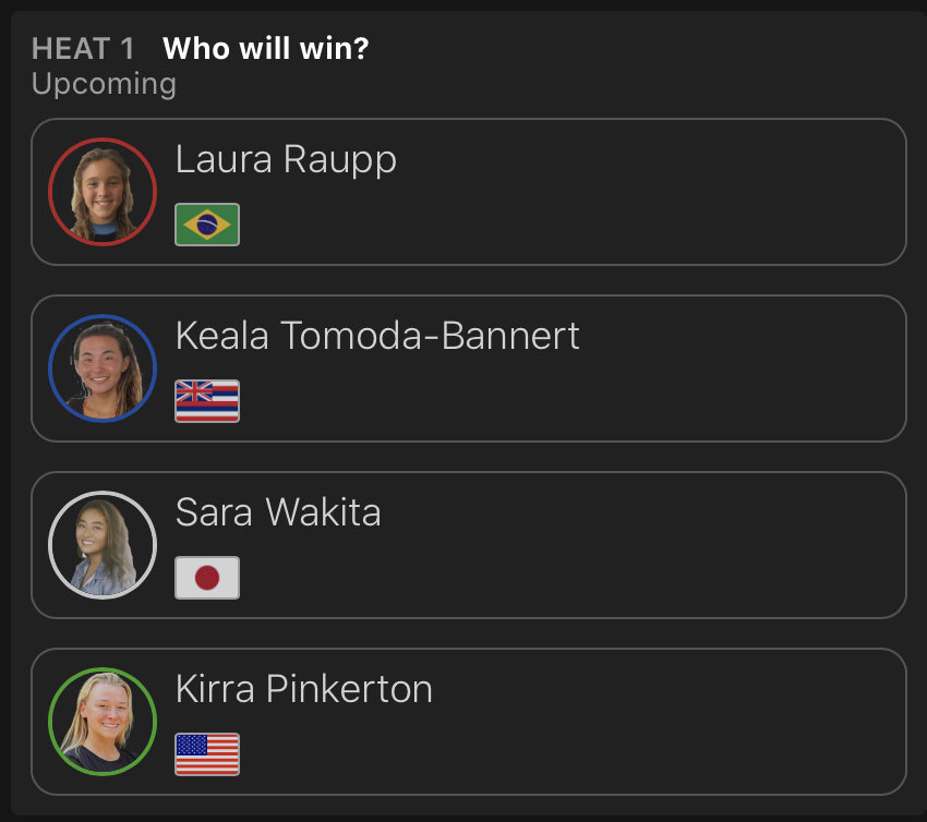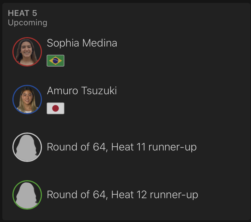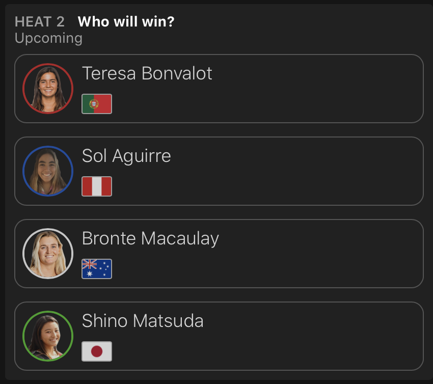 出場した日本人選手が全員勝ち上がった中、コンテストDAY3はDAY2で行われたなかった松永莉奈が登場するWOMENSラウンドオブ64のヒート11からスタートすることが予想される。
