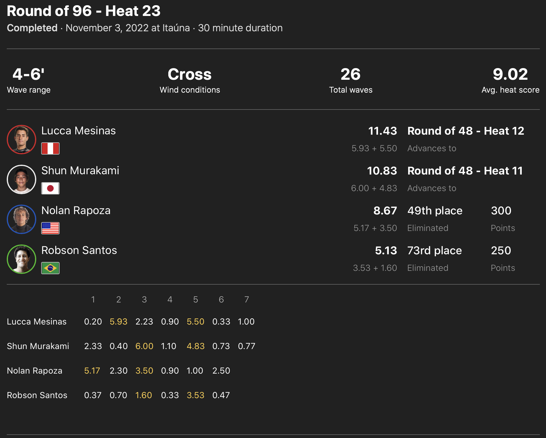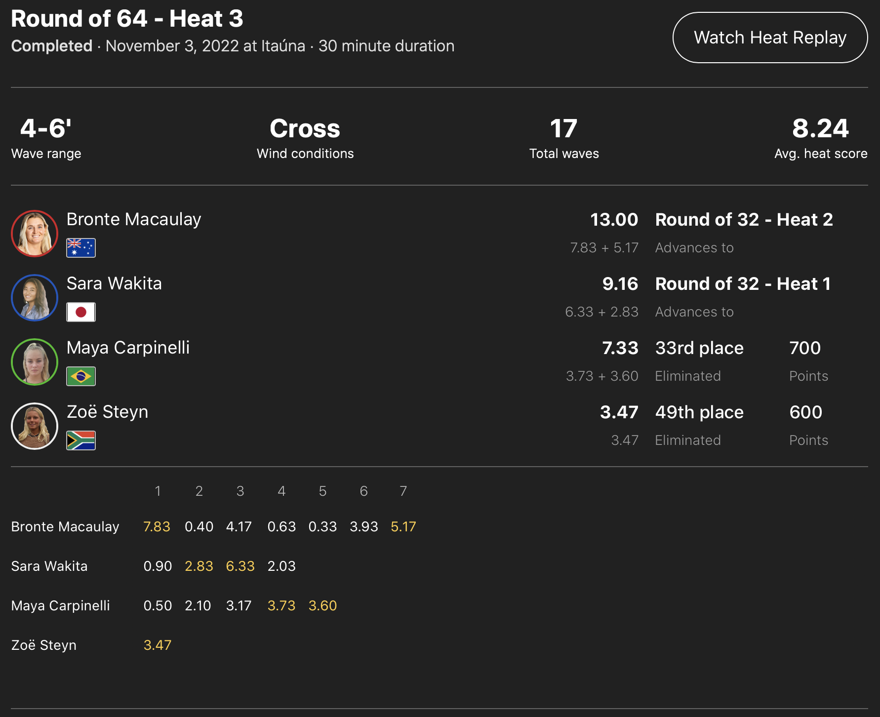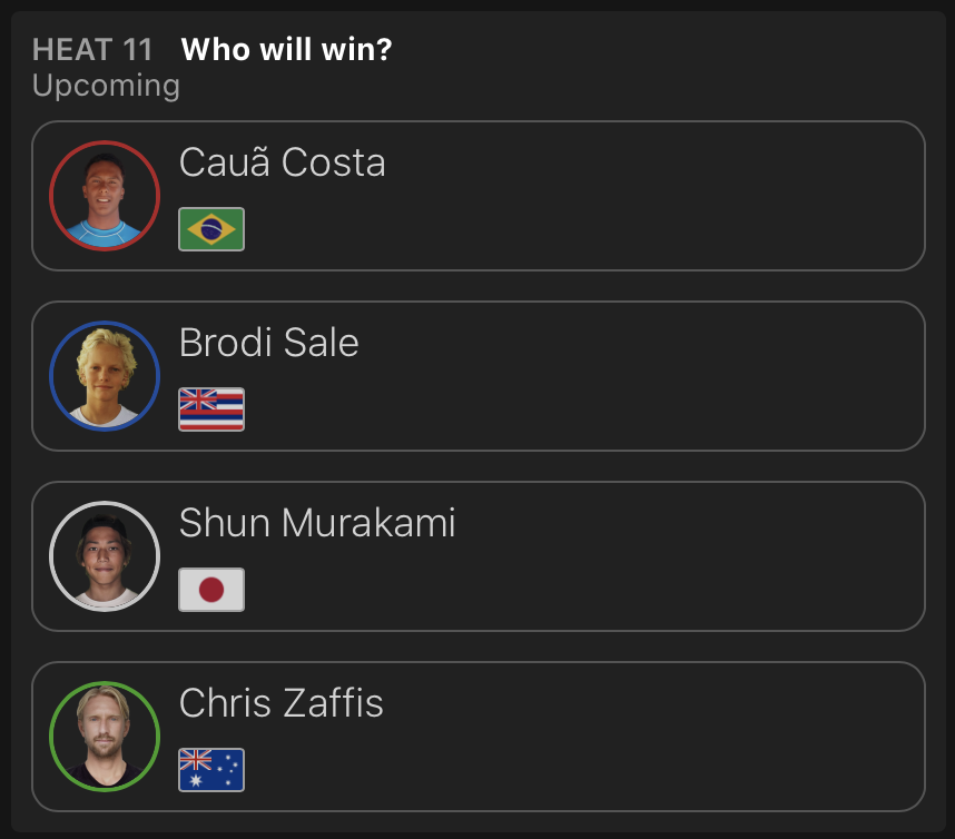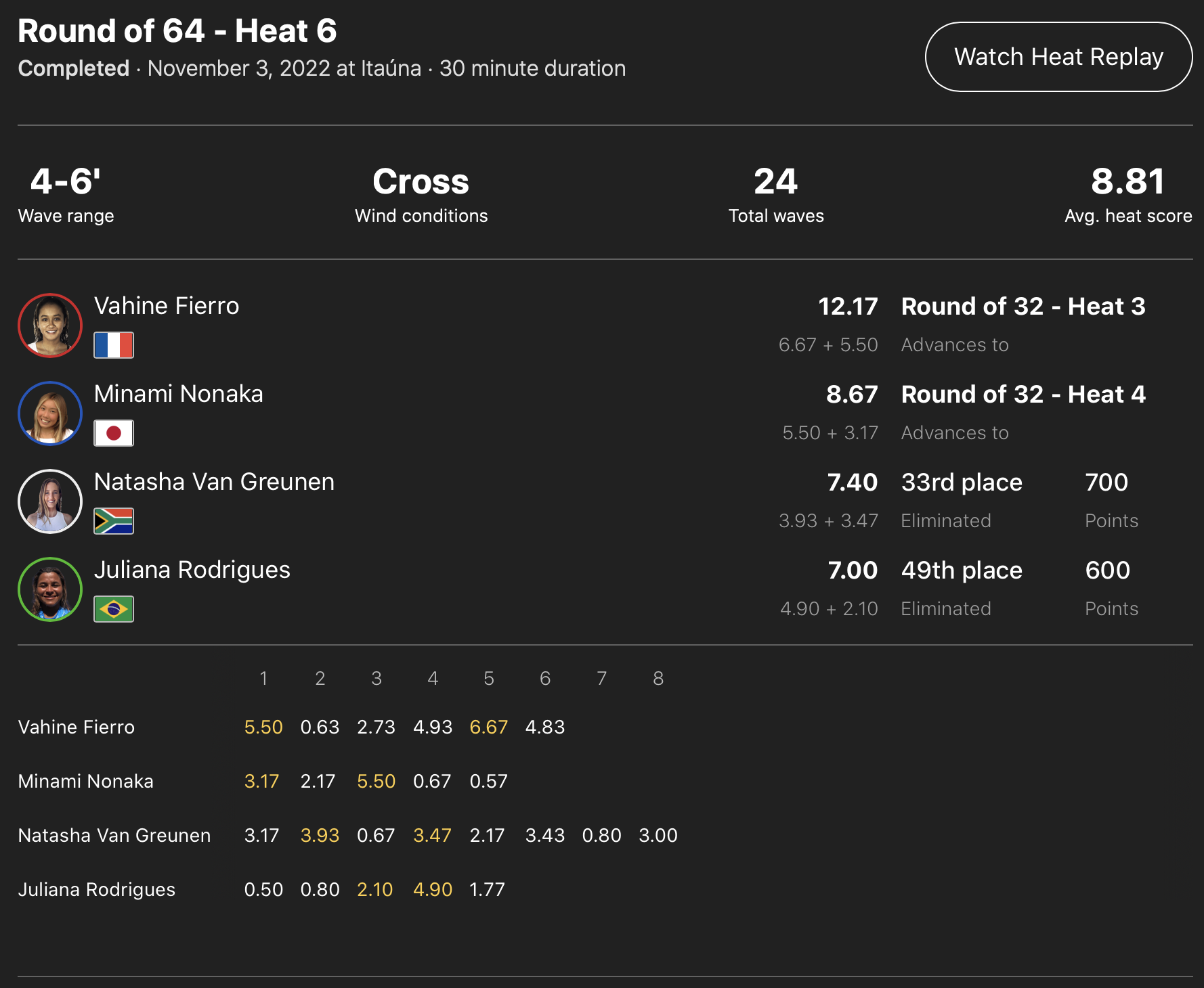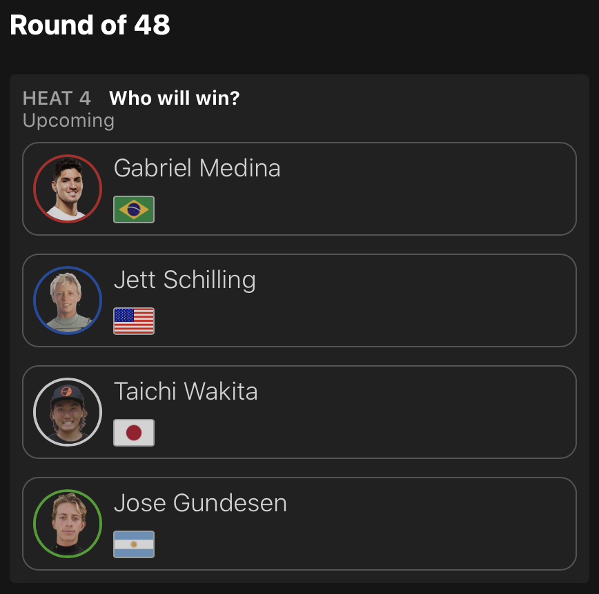 出場した日本人選手が全員勝ち上がった中、コンテストDAY3はDAY2で行われたなかった松永莉奈が登場するWOMENSラウンドオブ64のヒート11からスタートすることが予想される。