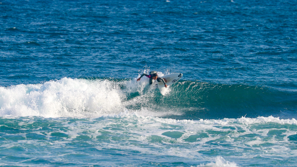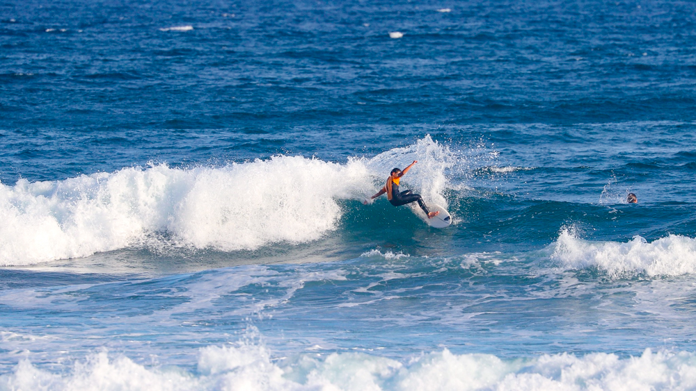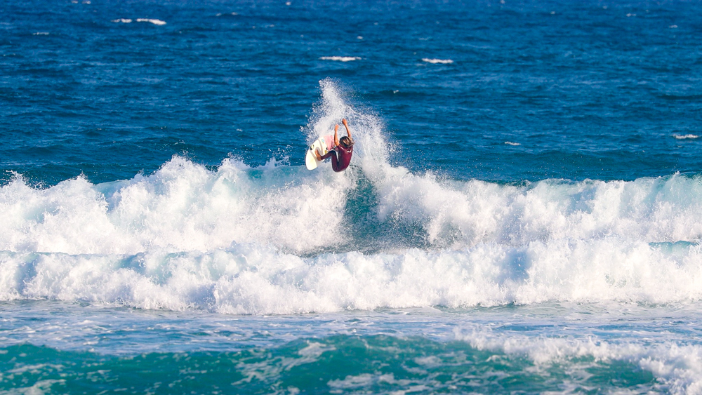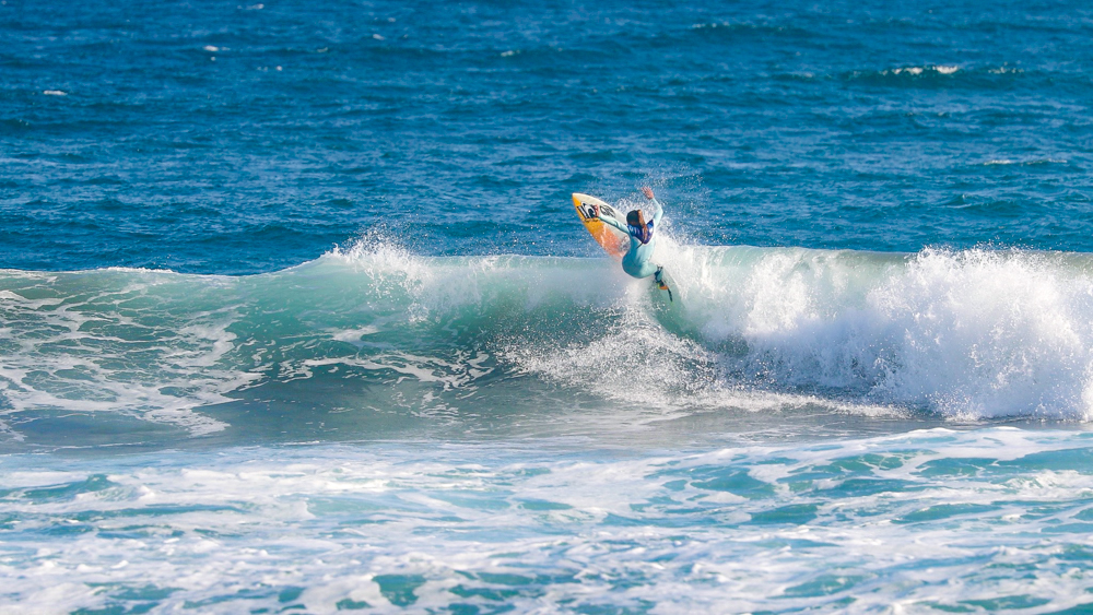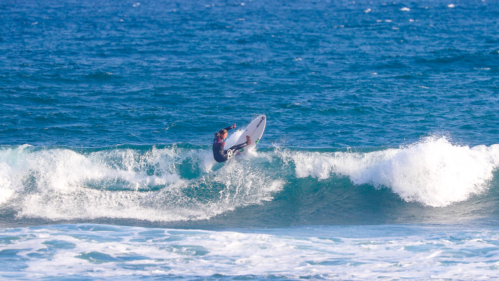 その息子Kai Kushnerも、風を味方につけたエアリバース、切れ味鋭いリッピング、そしてテールがルースするほどのレイトテイクオフからレールをはめ込んでチューブを駆け抜けるバックサイド・グラブレールと、さすが16歳以下男子アメリカ代表選手らしいスタイリッシュかつスピーディーでハイレベルなライディングを連発した。