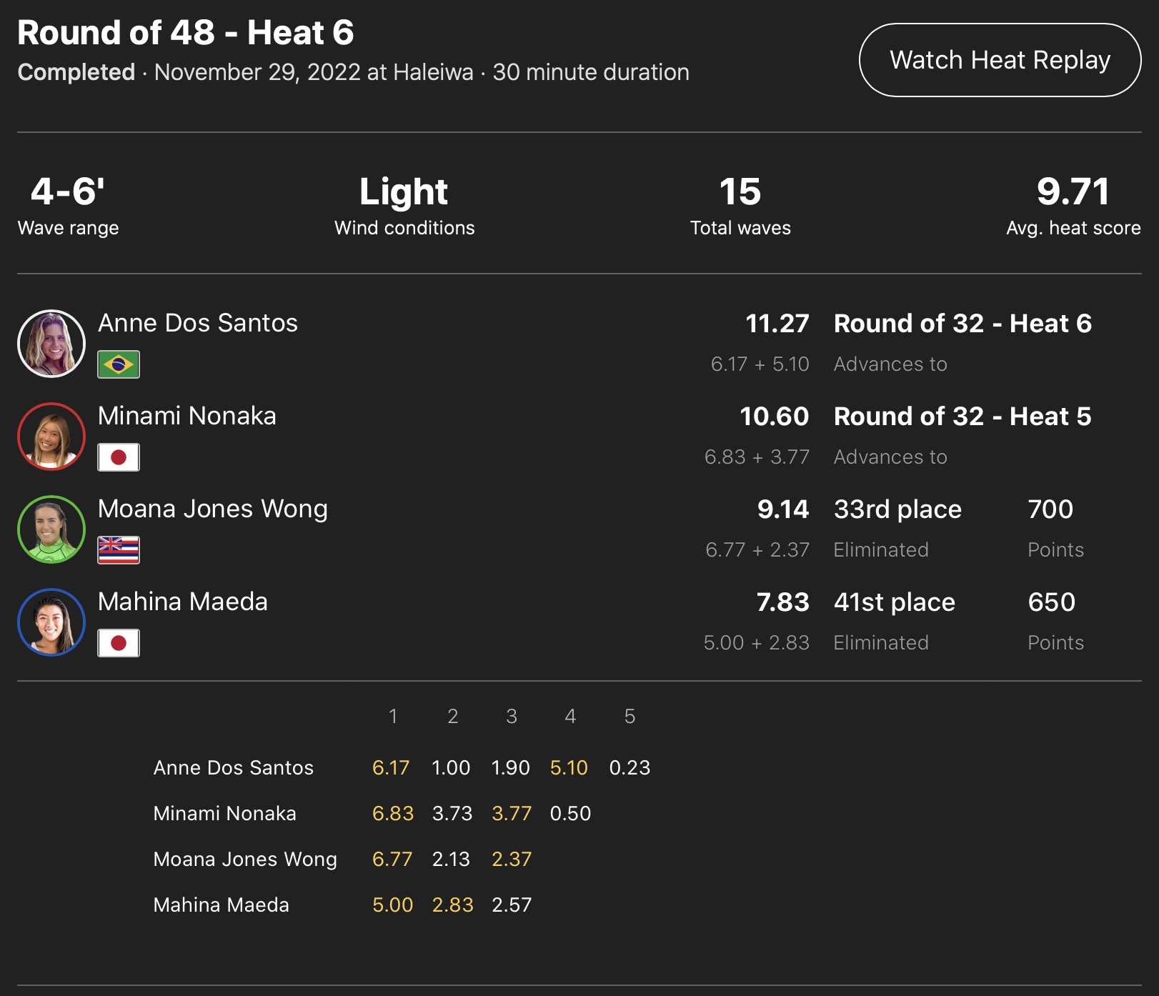 注目の日本人選手たちの活躍は、WOMENSラウンドオブ48のヒート6で1本目の波から深いボトムターからのリップ2発で6.83ptをマークした野中美波が2位のポジションでラウンドオブ32へ進出!