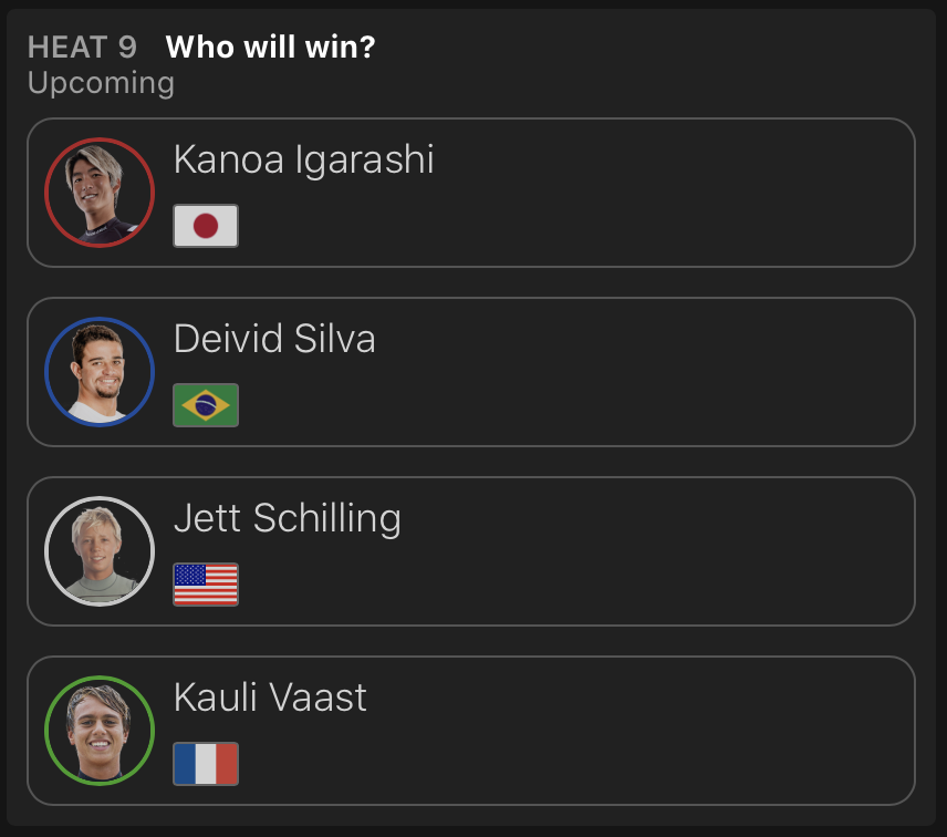 ヒート9では五十嵐カノアがDeivid Silva、Jett Schilling、Kauli Vaastと対戦。