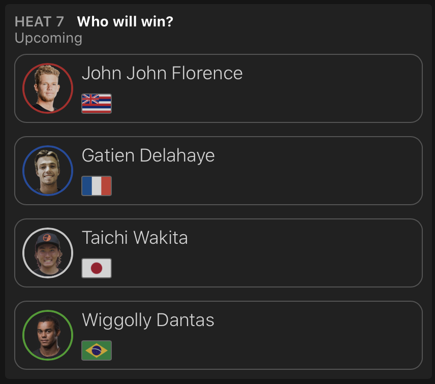 残る日本人選手たちのヒートスケジュールは、MENSラウンドオブ64のヒート7に脇田泰地がJohn John FlorenceやWiggolly Dantas、Gantian Delahayeと対戦。
