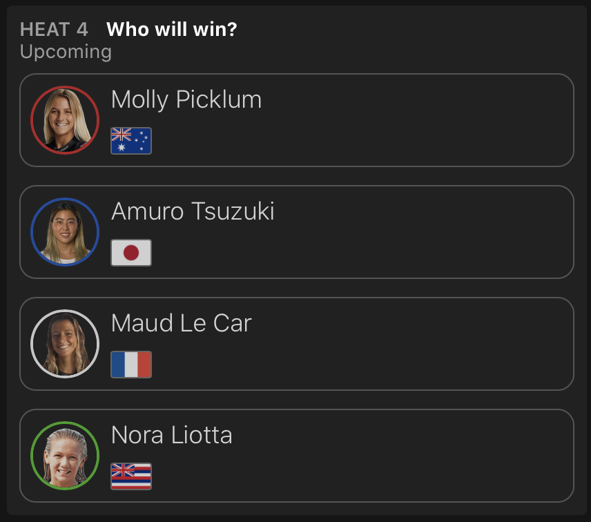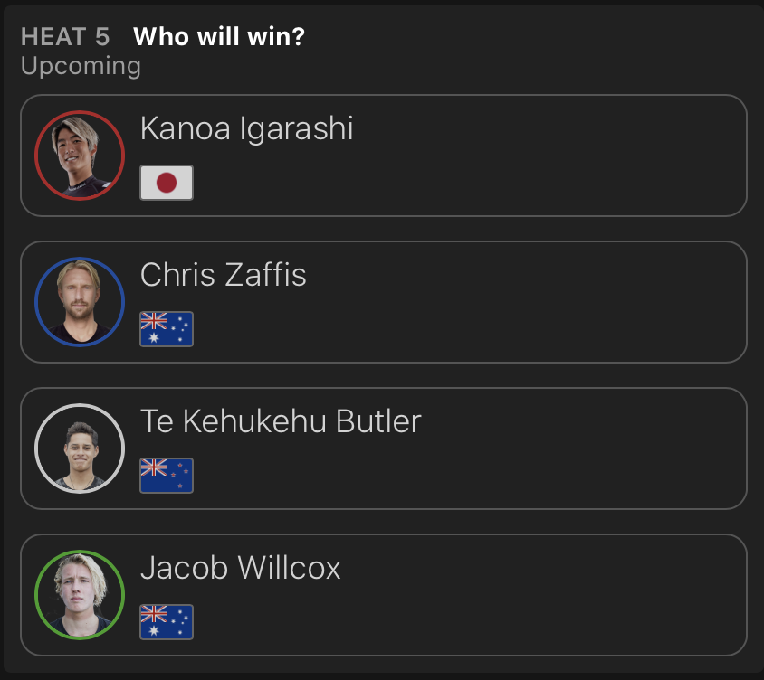 コンテストDAY2で見せ場を作った五十嵐カノアは迎えるラウンドオブ32のヒート5に組み込まれ、Chris Zaffis、Te Kehukehu Butler、Jacob Wilcoxと対戦予定。