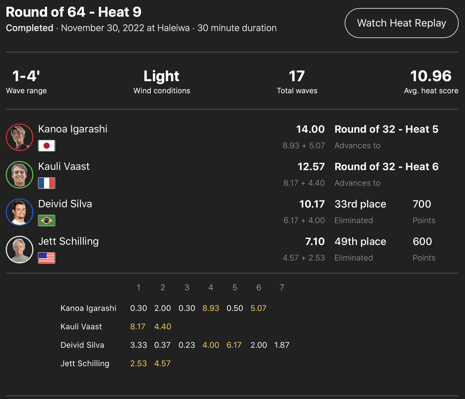 その一方でヒート7に出場となった脇田泰地はワールドチャンプJohn John FlorenceとGatien Delahayeにあと一歩及ばず、ここで敗退となってしまった。