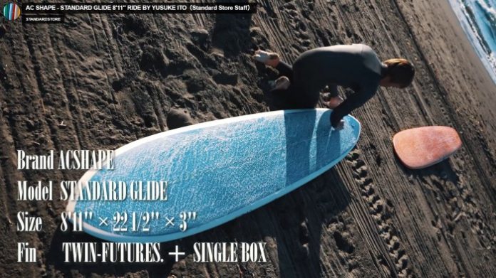 今回はそんなAC SHAPEのSTANDARD GLIDEモデルを、STANDARD STOREスタッフであり無類の波乗り好きである伊藤祐介がシングルフィンとツインフィンの両方のセッティングでテストライド!