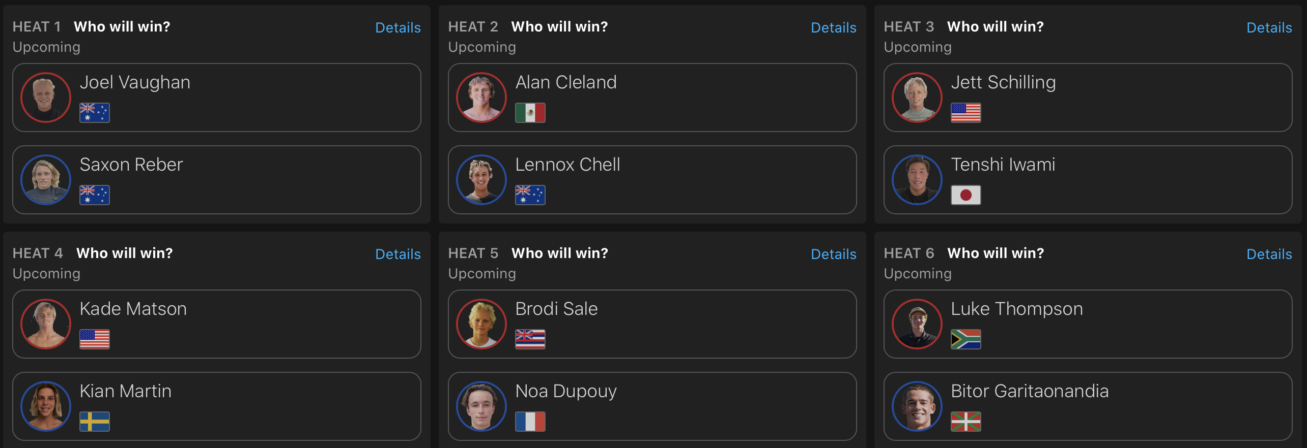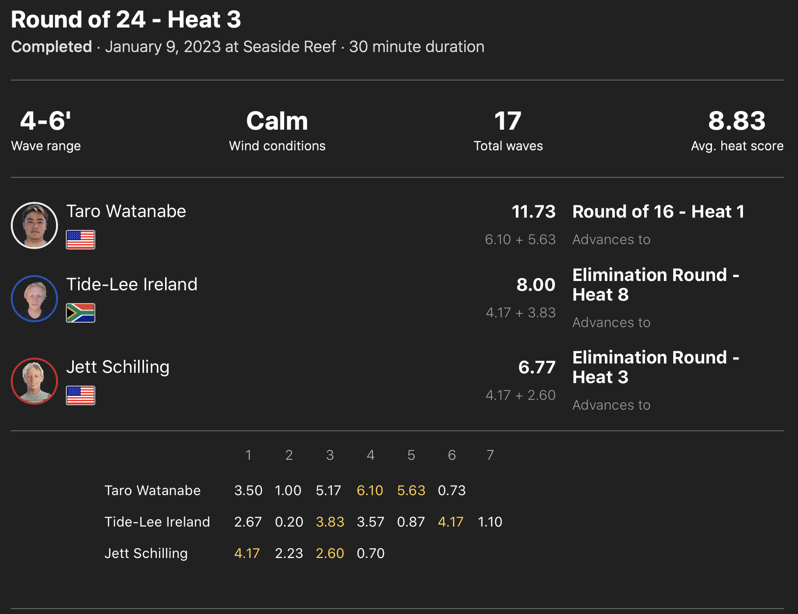 注目の日本人選手たちの活躍は、アメリカ代表選手として本イベントに参戦する渡辺太郎がヒート3を1位で勝ち上がり、ラウンドオブ16進出。