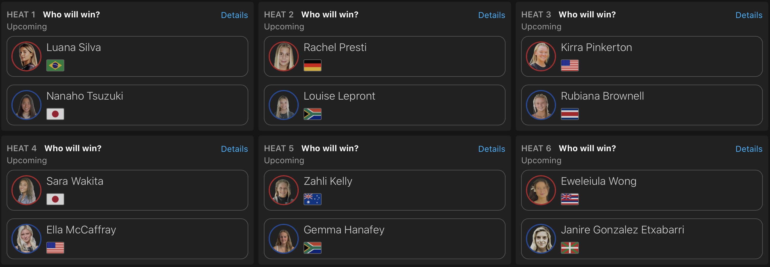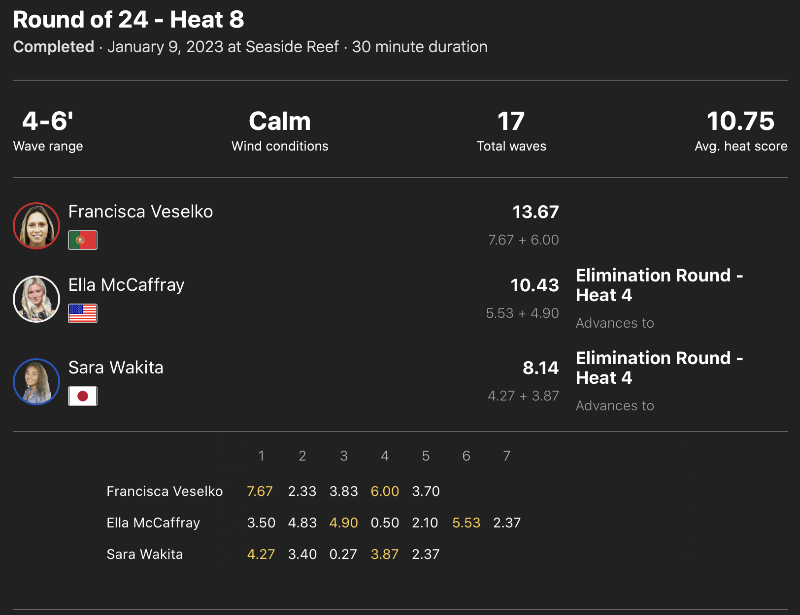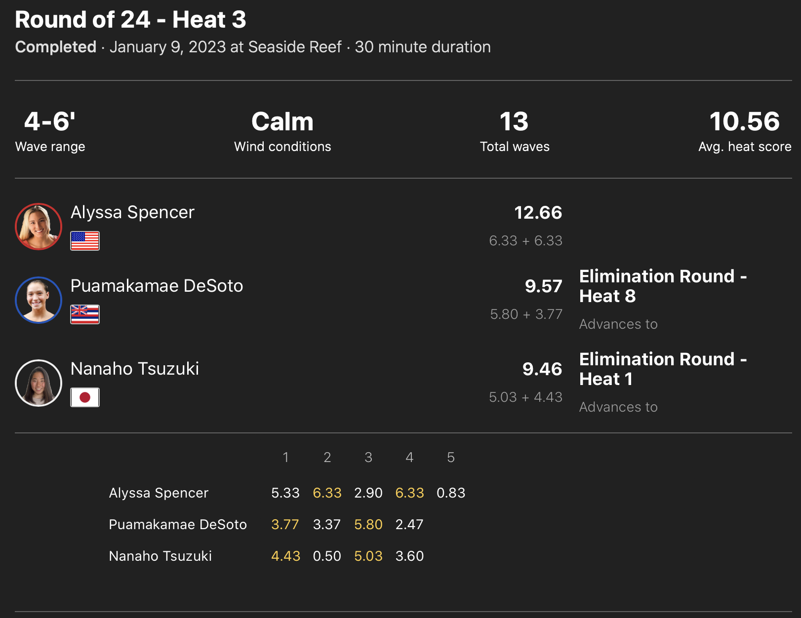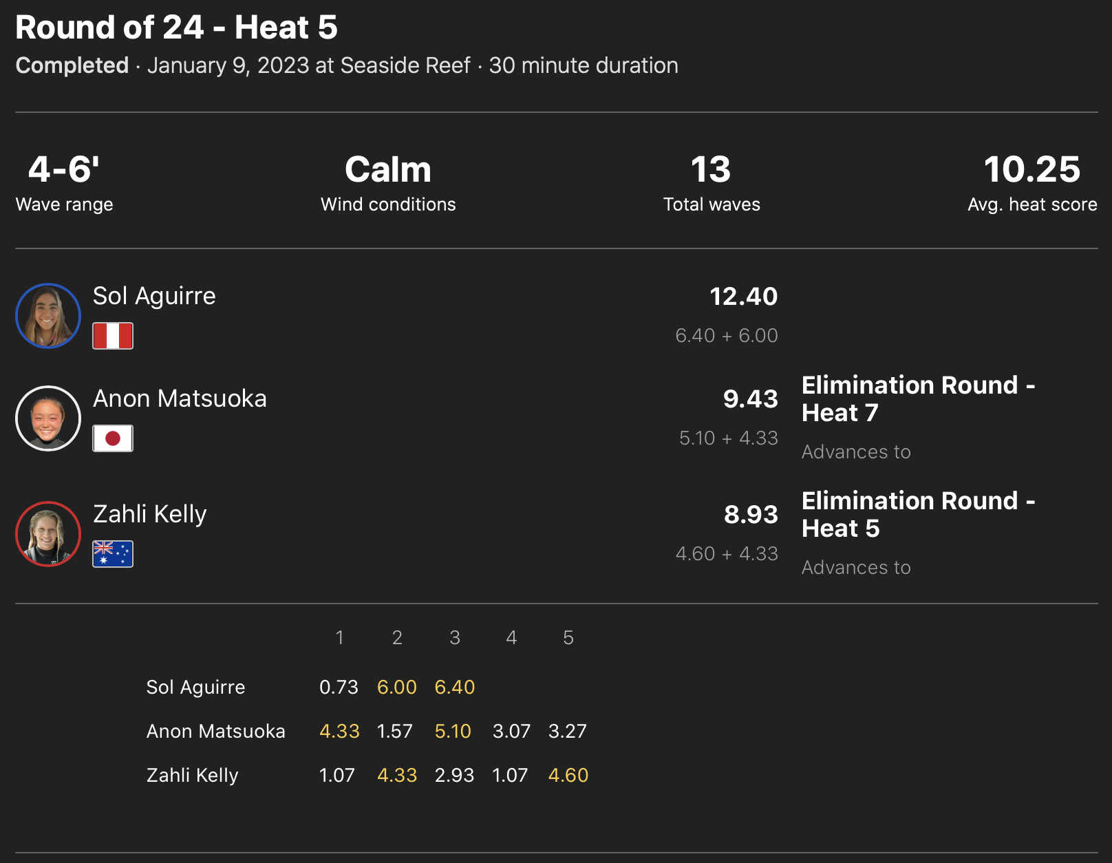バックアップをまとめきれず惜しくも3位となったヒート1の岩見天獅、WOMENSのヒート3で3位となった都築虹帆、ヒート5で2位となった松岡亜音、ヒート8で3位となった脇田紗良は敗者復活戦となるイリミネーション・ラウンドへと駒を進めた。