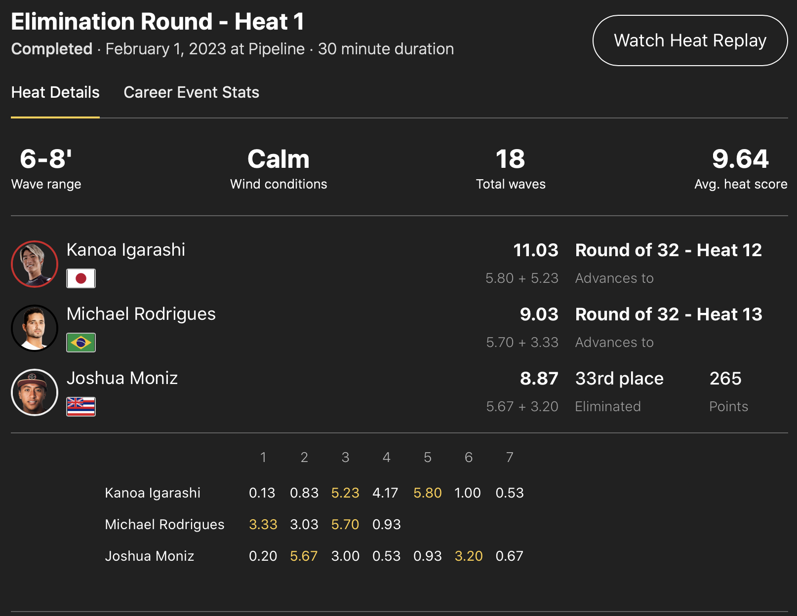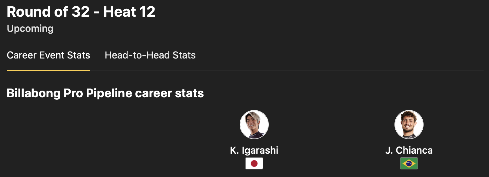 続くヒート12では五十嵐カノアがJoao Chiancaと対戦予定となっている。