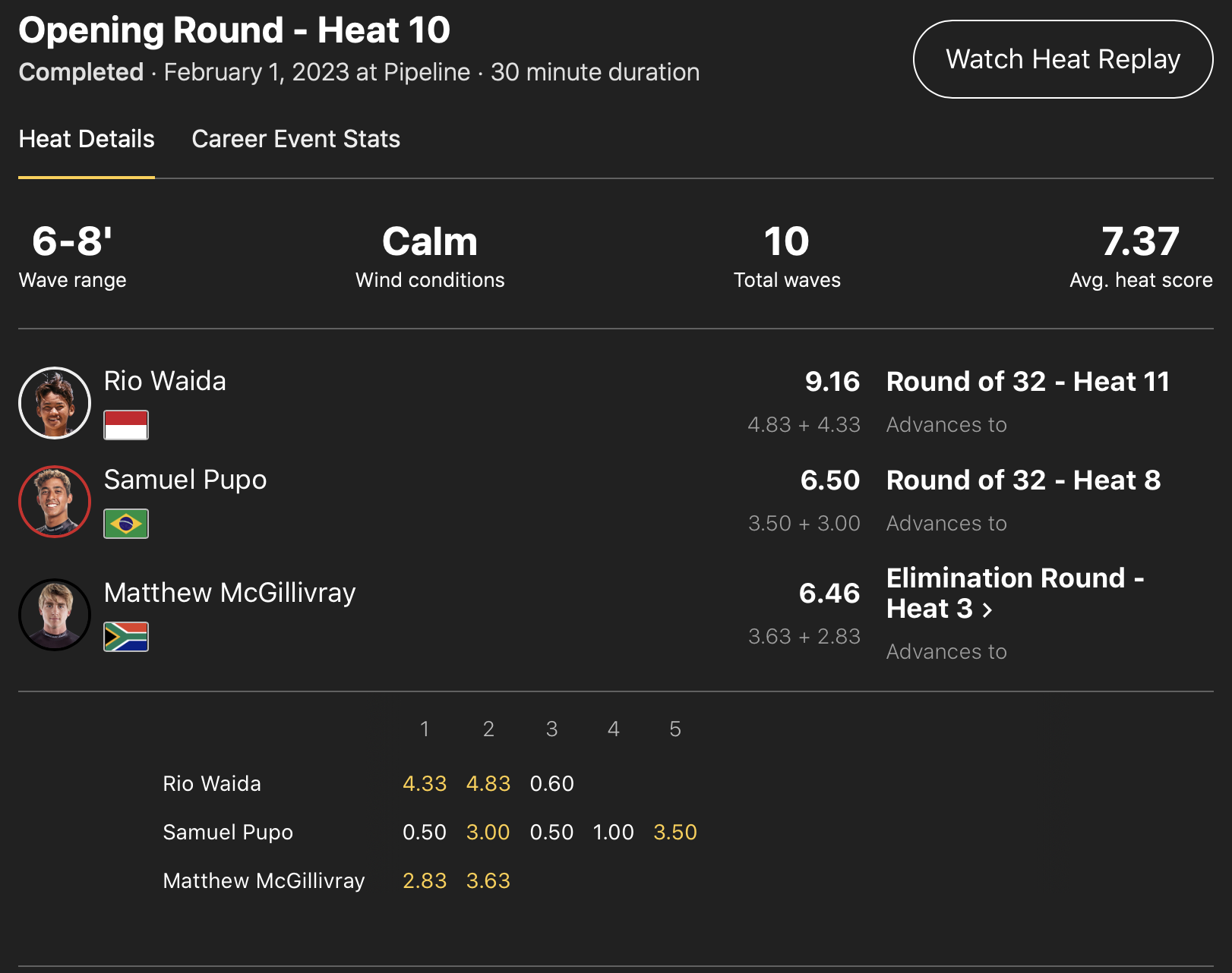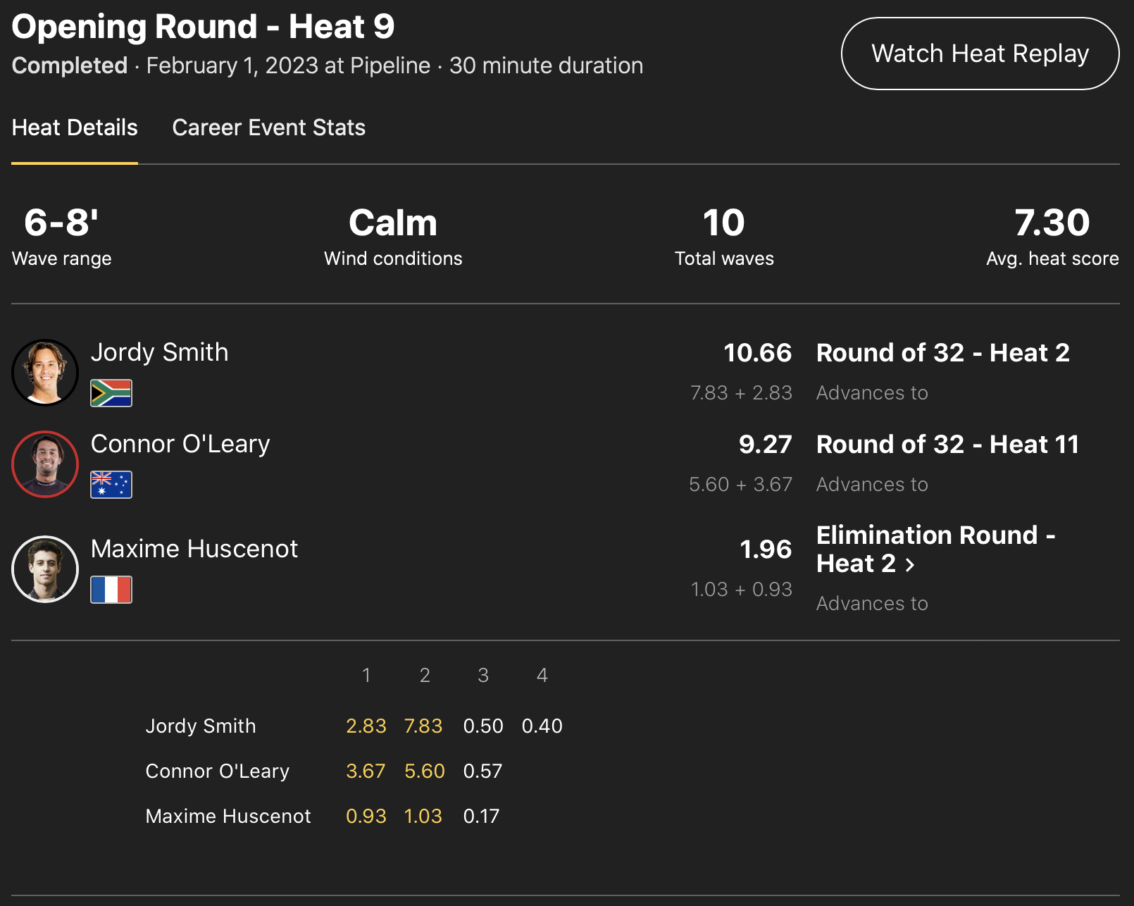さらにオープニンング・ラウンドのヒート9ではConnor O’learyがJordy Smithに次ぐ2位のポジションでラウンドオブ32へ、インドネシア初のCTルーキー和井田理央はヒート10でSamuel PupoとMatthew McGillivrayを抑えた1位のポジションで勝ち上がり、共にイリミネーション・ラウンドをスキップする形でラウンドオブ32へと駒を進めた!