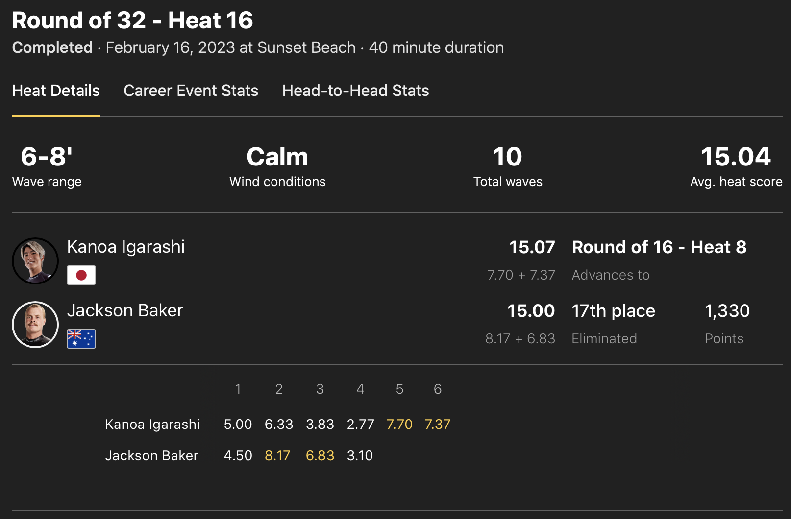 注目の五十嵐カノアは、ラウンドオブ32のヒート16で残り5分で掴んだ波で見事逆転を果たし、わずか0.07ptの僅差でJackson Bakerを抑えてラウンドアップ!