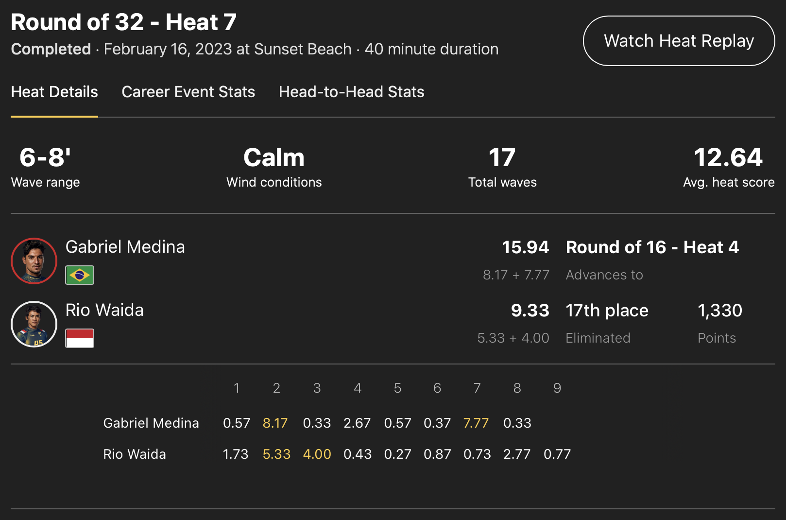 さらに、インドネシア初のCTルーキー和井田理央はラウンドオブ32のヒート7でワールドチャンプGabriel Medinaに敗退。