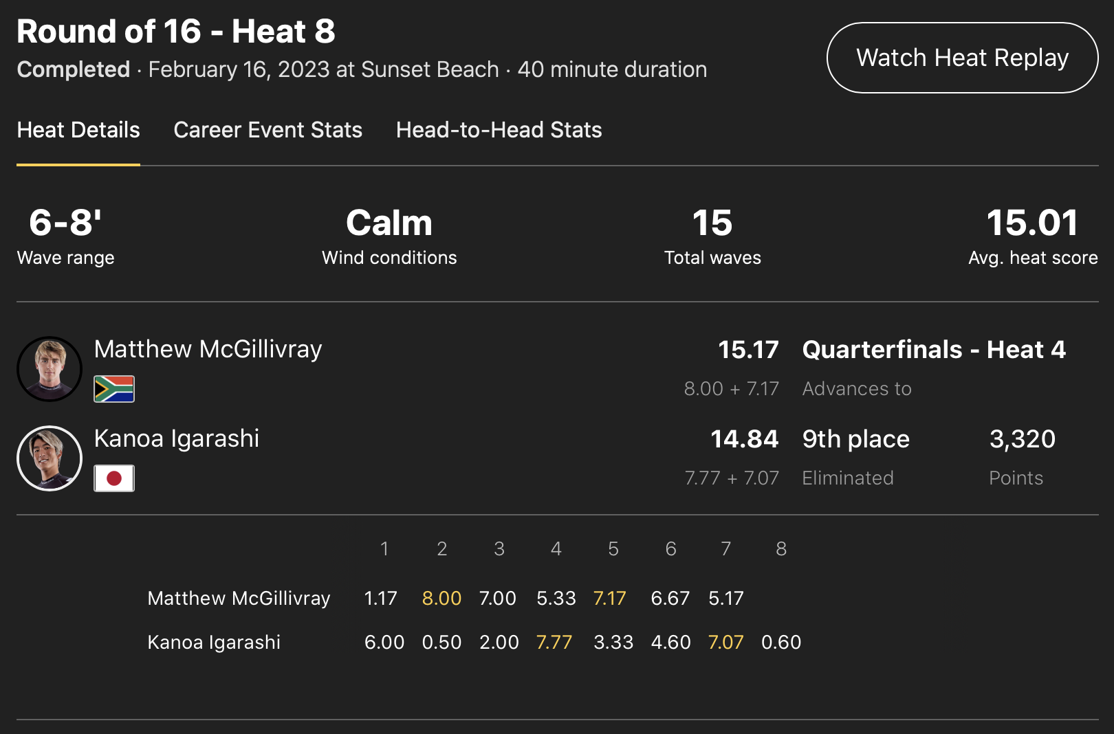 Matthew McGillivrayがリードをはかる中、五十嵐カノアも4本目の波で7.77pt、さらに7本目の波で7.07ptをまとめたものの、逆転する子ができず、惜しくもここれ敗退となり、今大会を9位でフィニッシュすることとなった。