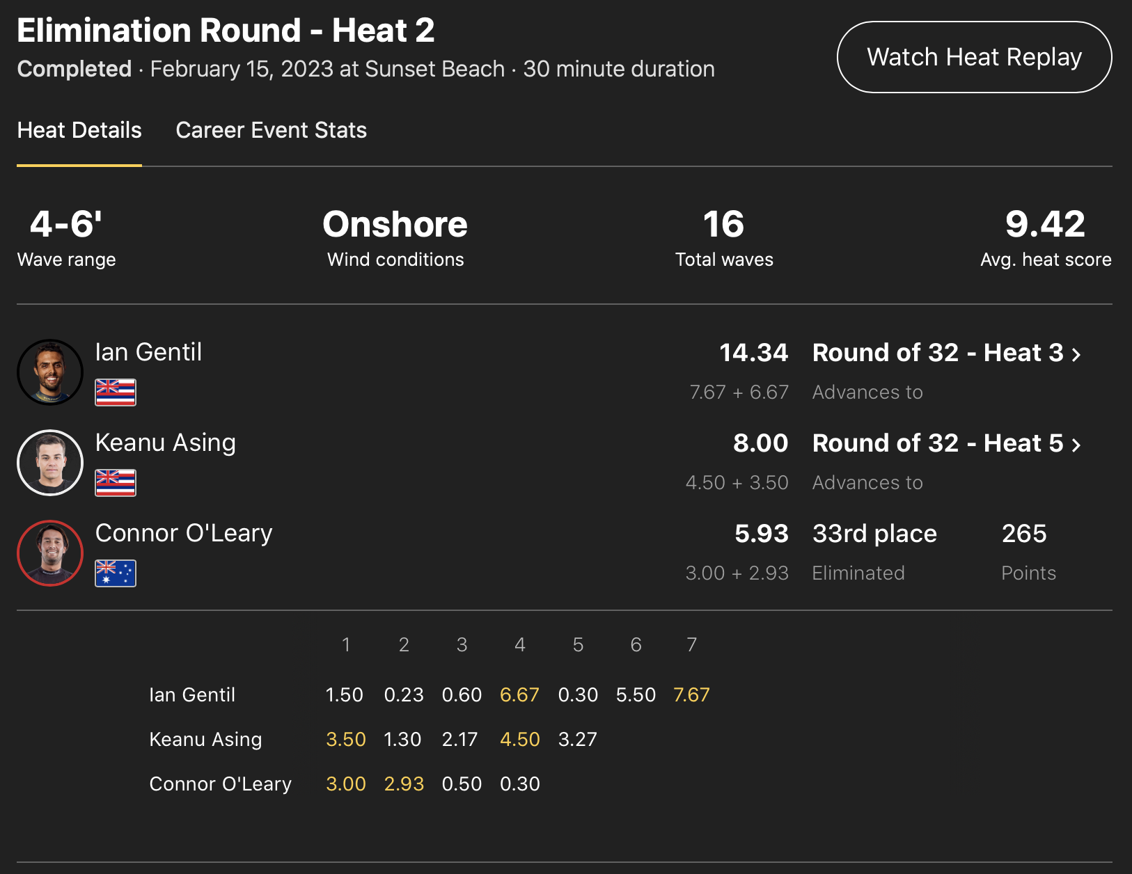 また、Connor O’learyは敗者復活戦となるイリミネーション・ラウンドのヒート2で敗退となってしまった。