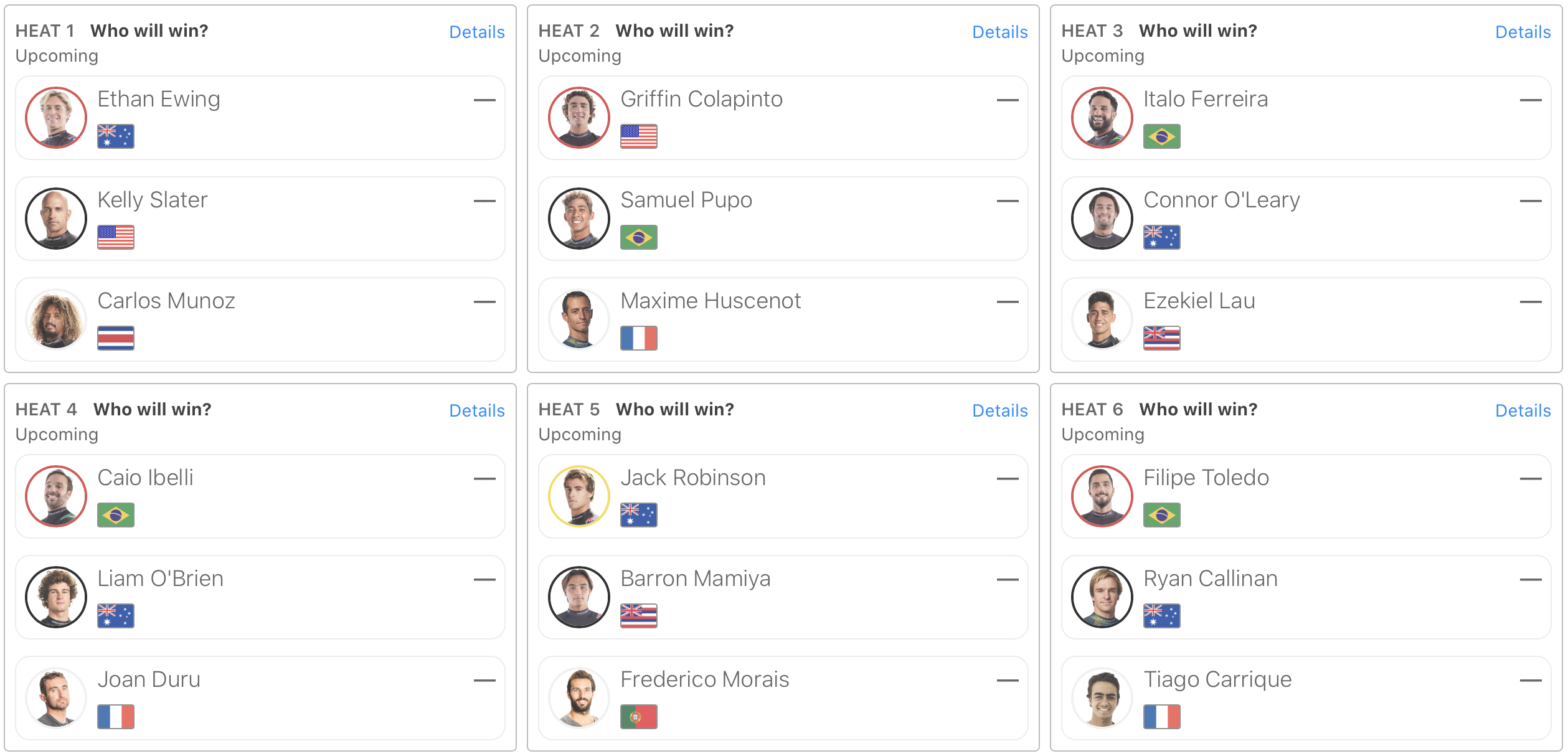 Connor O’learyはヒート3でItalo Ferreira、Ezekiel Lauと、和井田理央はヒート12でGabriel Medina、Jordy Smithと対戦予定となっている。