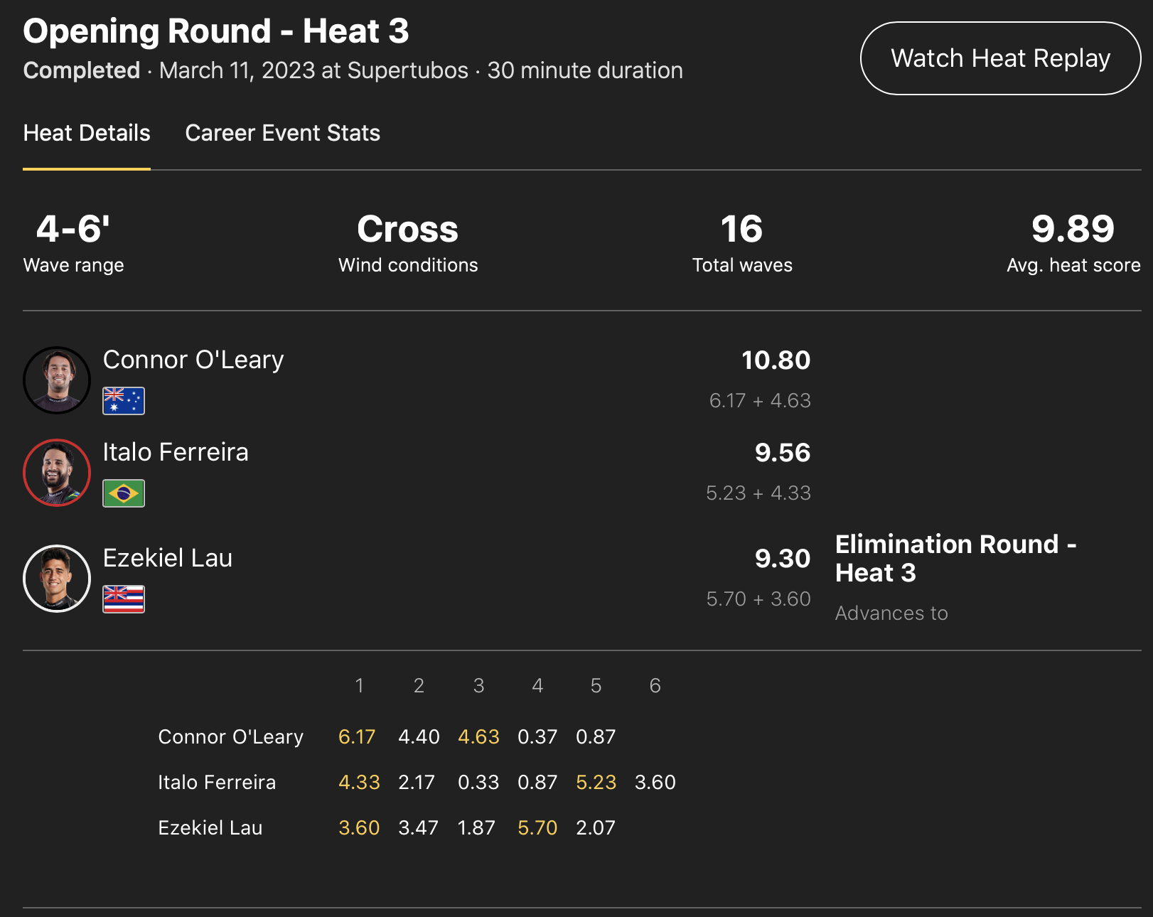 その一方で注目のConnor O’learyは、オープニングラウンドのヒート3でパワフルなバックサイドを武器にグッドスコアを連発し、ワールドチャンプItalo Ferreiraを2位に、Ezekiel Lauを3位に抑えて1位でラウンドオブ32へ進出!