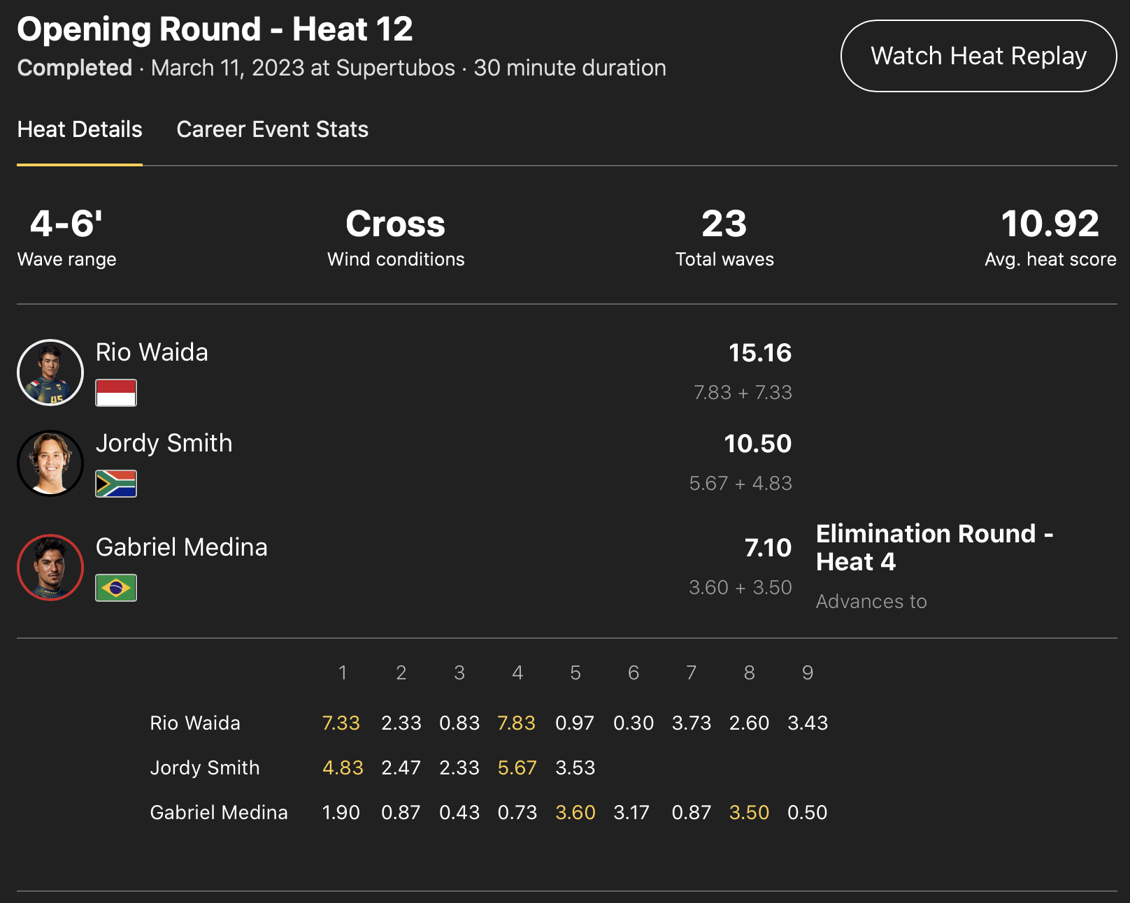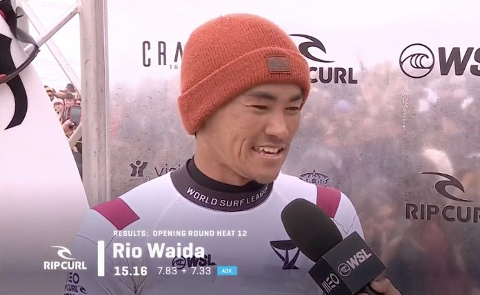さらにインドネシアと日本のハイブリッド・サーファー和井田理央は、ヒート12でJordy SmithとワールドチャンプGabriel Medinaといった強豪を相手に、萎縮するどころか思い切ったビッグエアリバースからのソリッドターンのコンボで7.33pt、空中でシフティーを入れる滞空時間の長いビッグエアで会場を沸かせて7.83ptと2本のハイスコアをまとめ、見事この日のハイエスト・トータルスコアをマークする形のダントツ1位でラウンドオブ32進出を果たした!