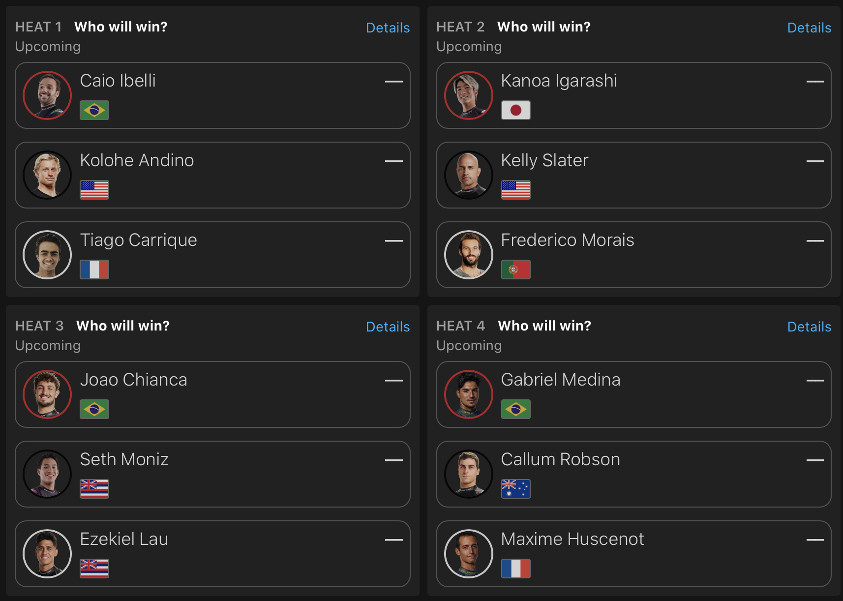 イリミネーションラウンドのヒート2ではKelly Slaterと母国ポルトガルのFrederico Moraisと対戦予定。