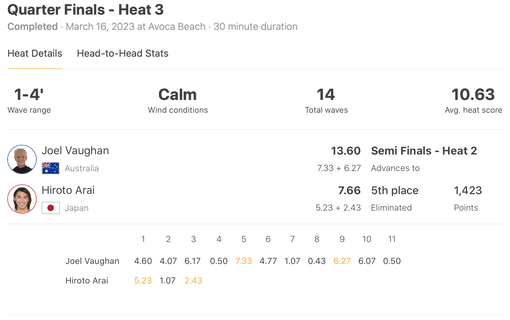 注目の日本人選手の活躍は、MENSで唯一この日まで勝ち残っていた新井洋人がラウンドオブ16のヒート3を1位で勝ち上がったものの、クォーターファイナルのヒート3でJoel Vaughanに敗退。