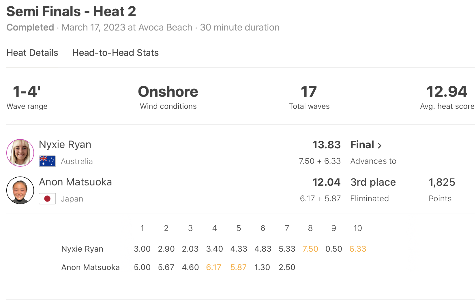 セミファイナル進出を果たした池田美来と松岡亜音の活躍に期待が掛かったが、ヒート1の池田美来はいい波を見つけにくいオンショアコンディションに翻弄されてスコアを伸ばすことができず、ヒート2の松岡亜音はグッドスコアを2本まとめてトータルスコア12.04ptを叩き出したもののNyxie Ryanが8本目に7.50pt、10本目に6.33ptを連発して逆転されてしまい、共に惜しくもここで敗退。