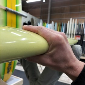 さらに、やや細身なノーズには深過ぎず浅過ぎないノーズコンケーブがセンター付近まで入れられ、目を引く角のないワイドなムーンテールが安定感あるノーズライドやハングテンをサポート。