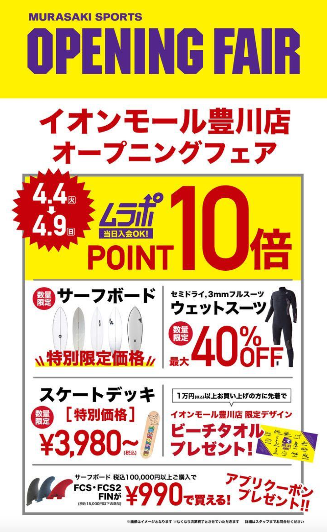 【祝!4/4 (火)】鵠沼店に次ぐ大型サーフ旗艦店が愛知県に登場! ムラサキスポーツ・イオンモール豊川店がグランドオープン!!