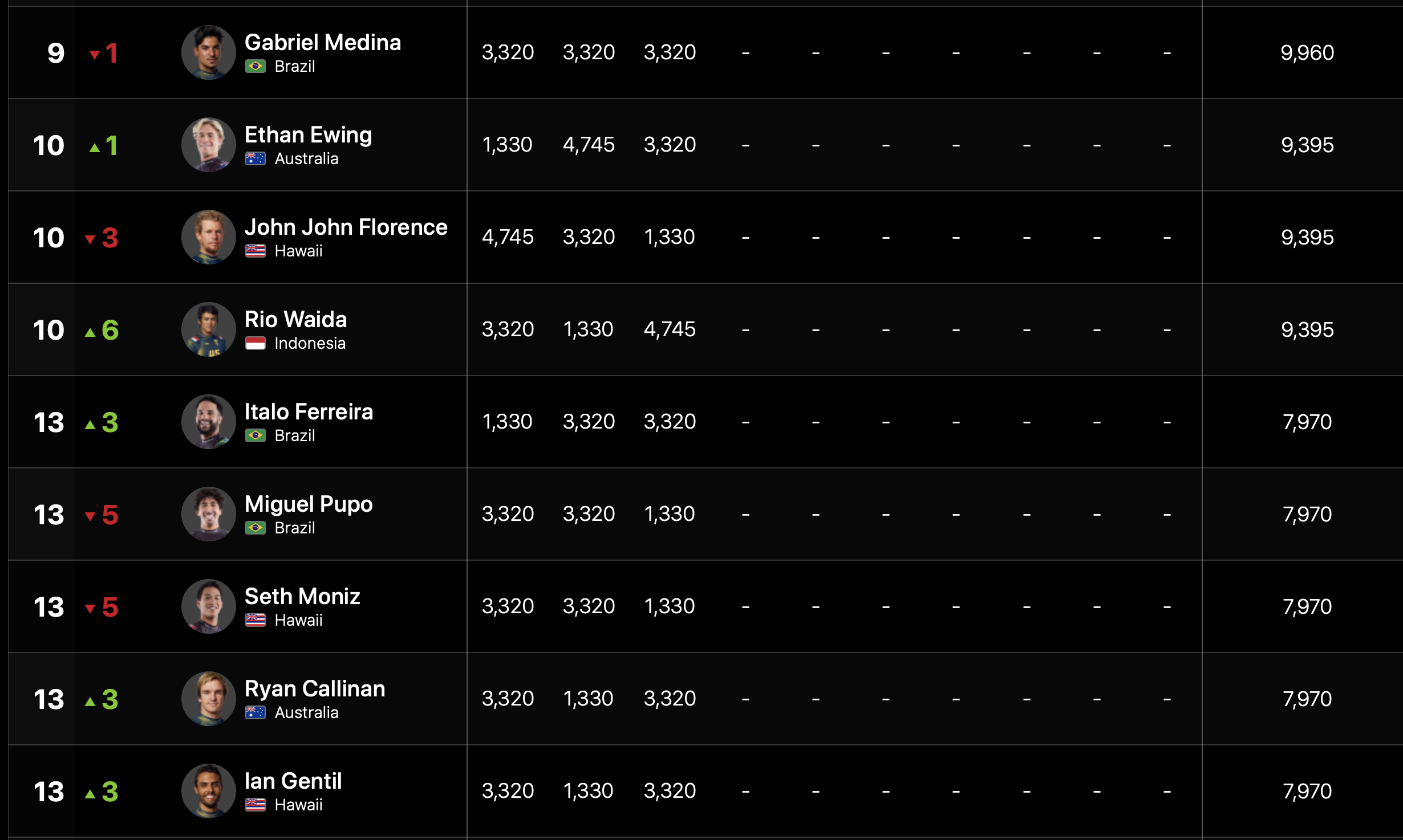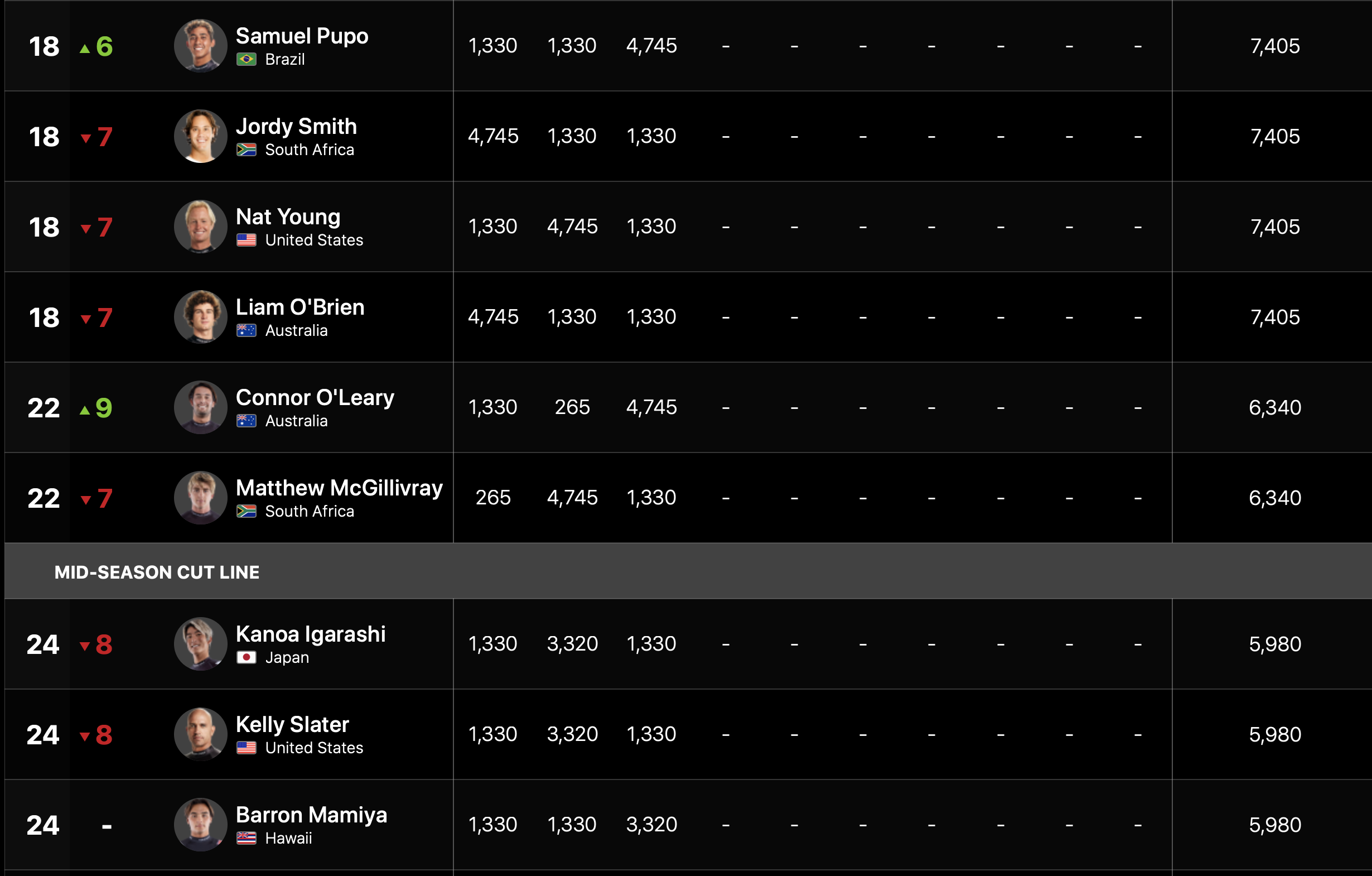 現時点でのCTランキングにおいて五十嵐カノアはKelly SlaterやBarron Mamiyaと同率の24位とボーダーライン以下にポジション。