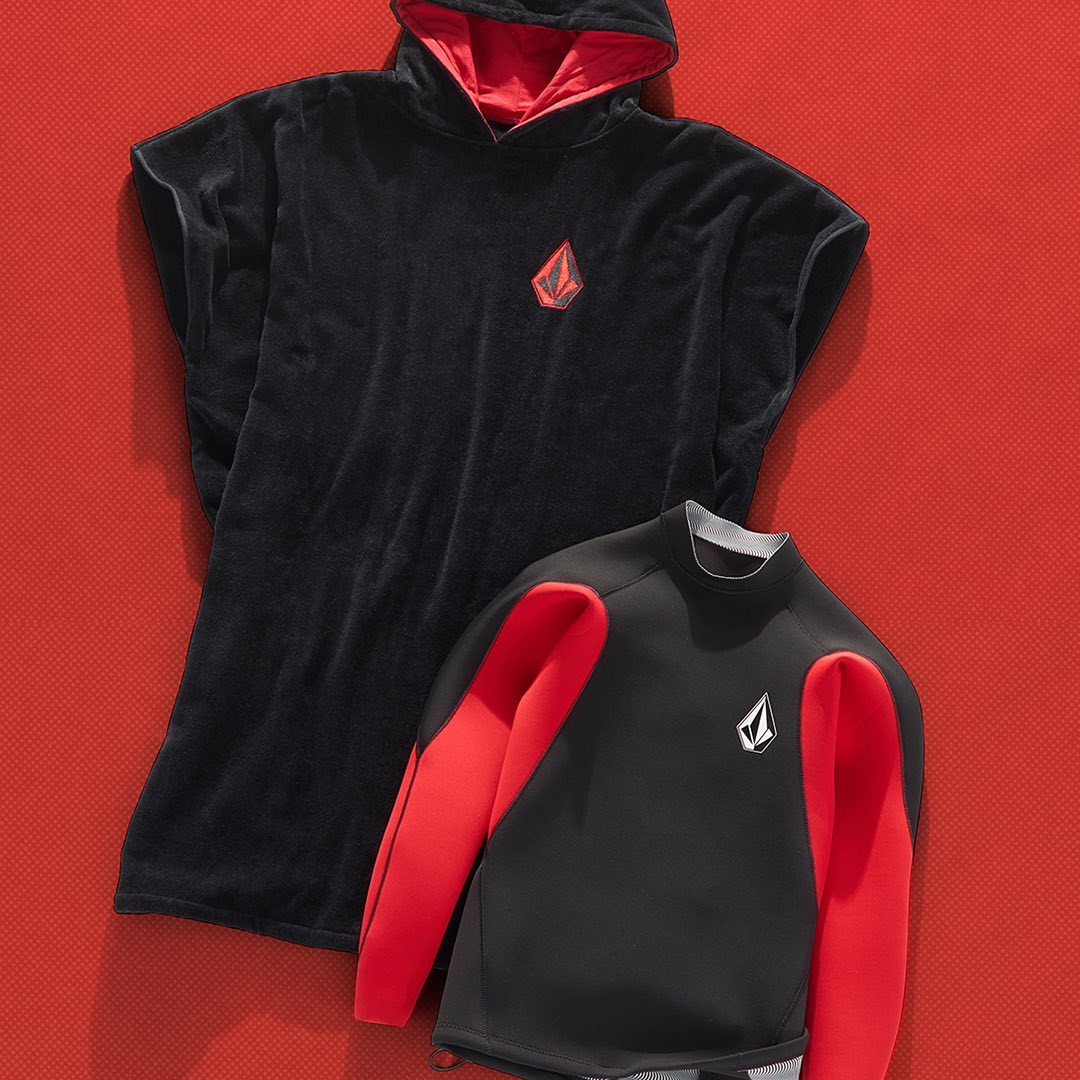 ブラックにレッドのVOLCOMストーンロゴが刺繍で施されたJack Robinsonコラボレーションモデルとなるフード付きポンチョ型のお着替えタオル。高い吸水性と速乾性、肌触りにもこだわったコットン100%。海で着替えるときの必需品。