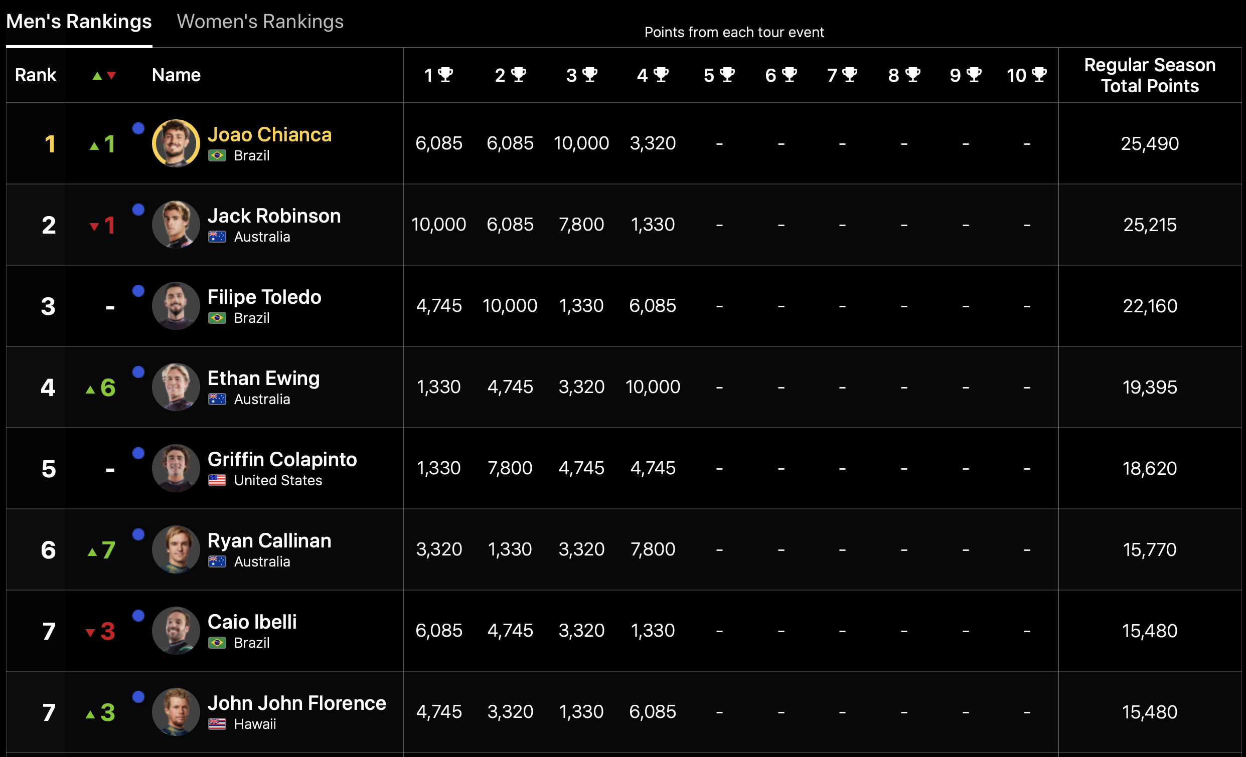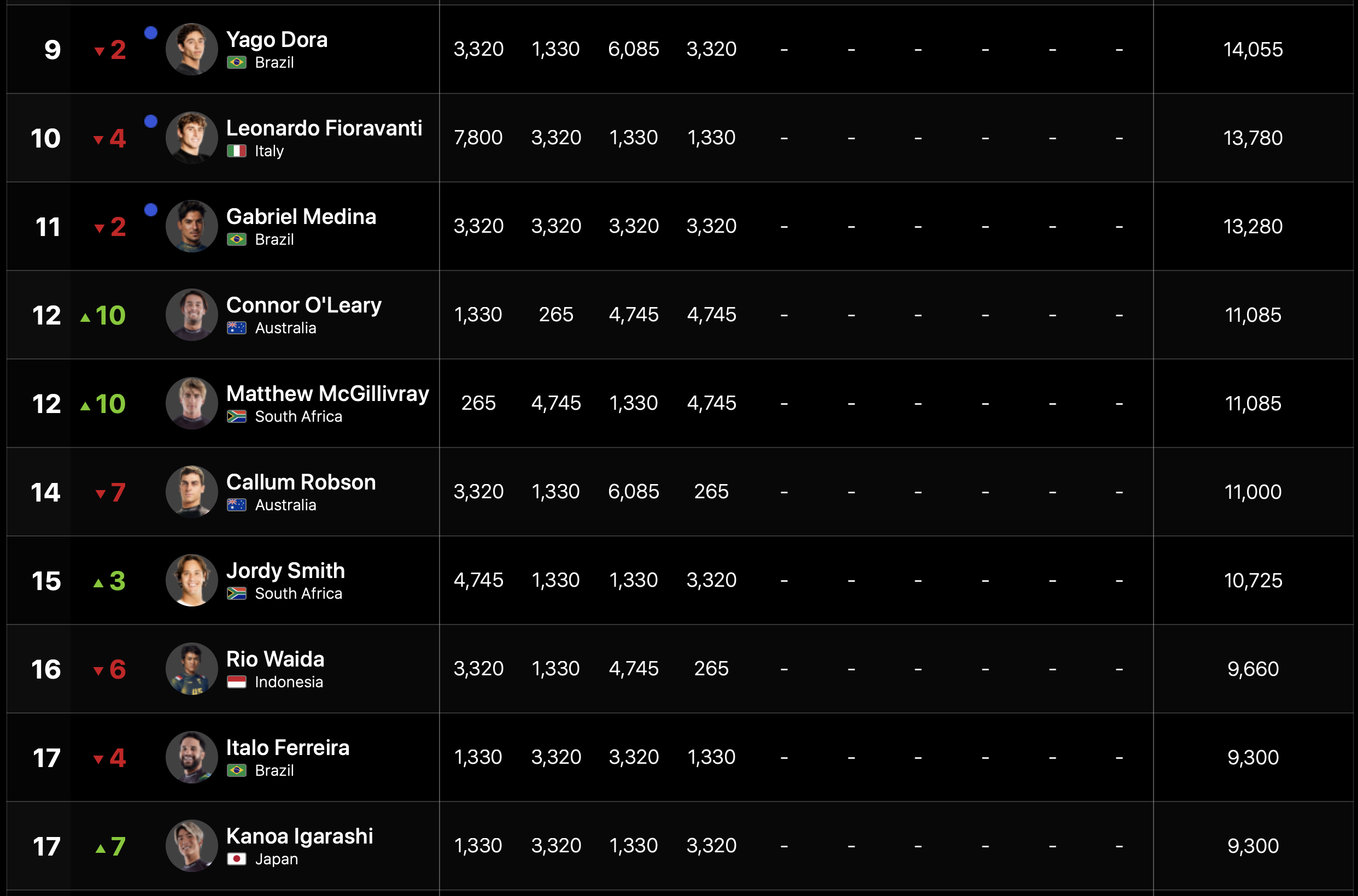 CT第4戦を終えた4/12(水)時点で五十嵐カノアがCTランキング17位、和井田理央が16位となっており、残るWSL CT 2023年のスケジュールは下記の通り。