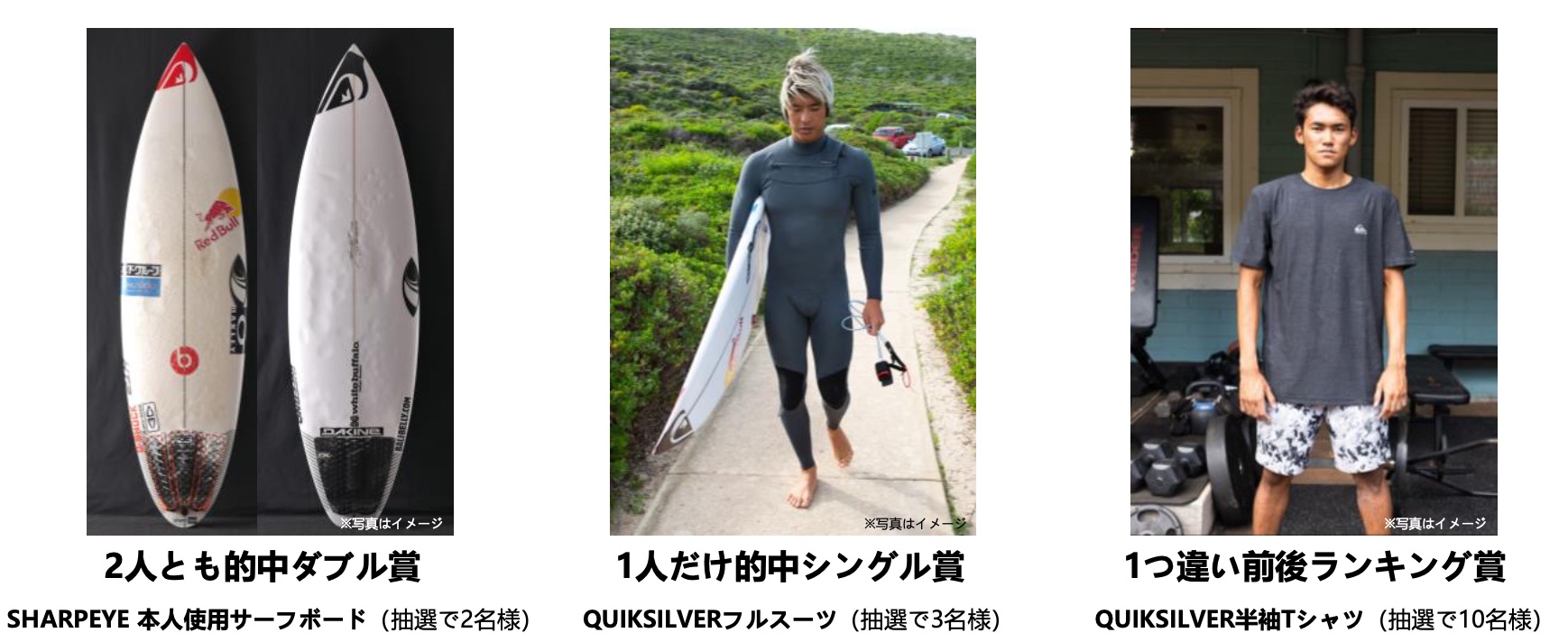 2人とも的中させたら本人仕様のSHARPEYE surfboardsを抽選で2名様に、1人的中させたらQUIKSILVERのウエットスーツを抽選で3名様に、1つ違い前後ランキング賞でQUIKSILVER半袖Tシャツを10名様に、2人ともハズレ賞で先着30名にQUIKSILVERステッカーが当たるこのビッグチャンスをお見逃しなく!!