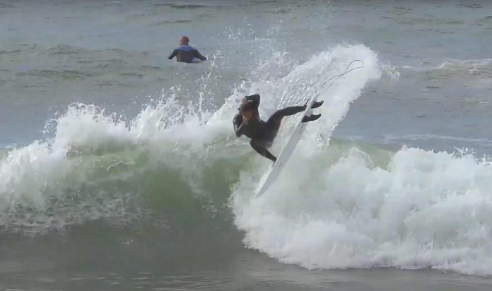 沖合で強く吹いた南西の風によるウインド・スウェルに加えて沿岸でも吹いたオンショアの影響で肩前後までサイズアップを果たした4/16(日)の湘南エリア。