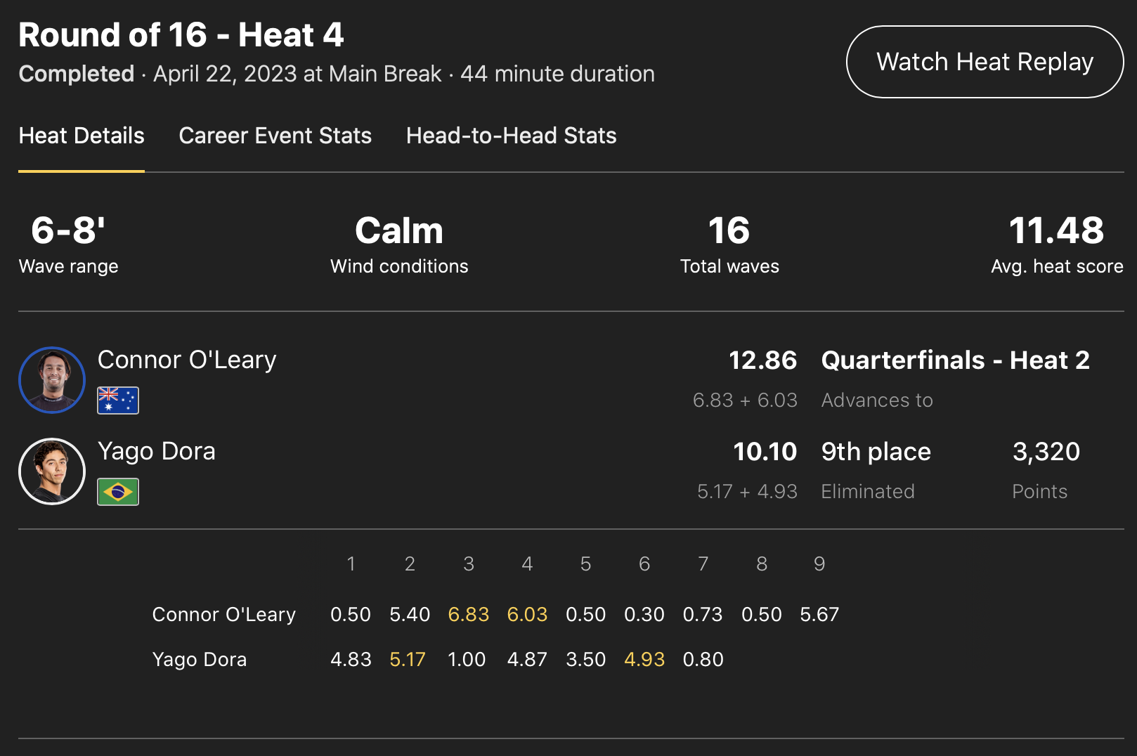 パワフルなバックサイドを武器に3本目に6.83pt、4本目に6.03ptをまとめ、トータルスコア12.86ptをマークして終始ヒートの流れを掴んだConnor O’learyが、スコアを伸ばし切れなかったYago Doraを抑える形で見事クォーターファイナル進出を決めた!!