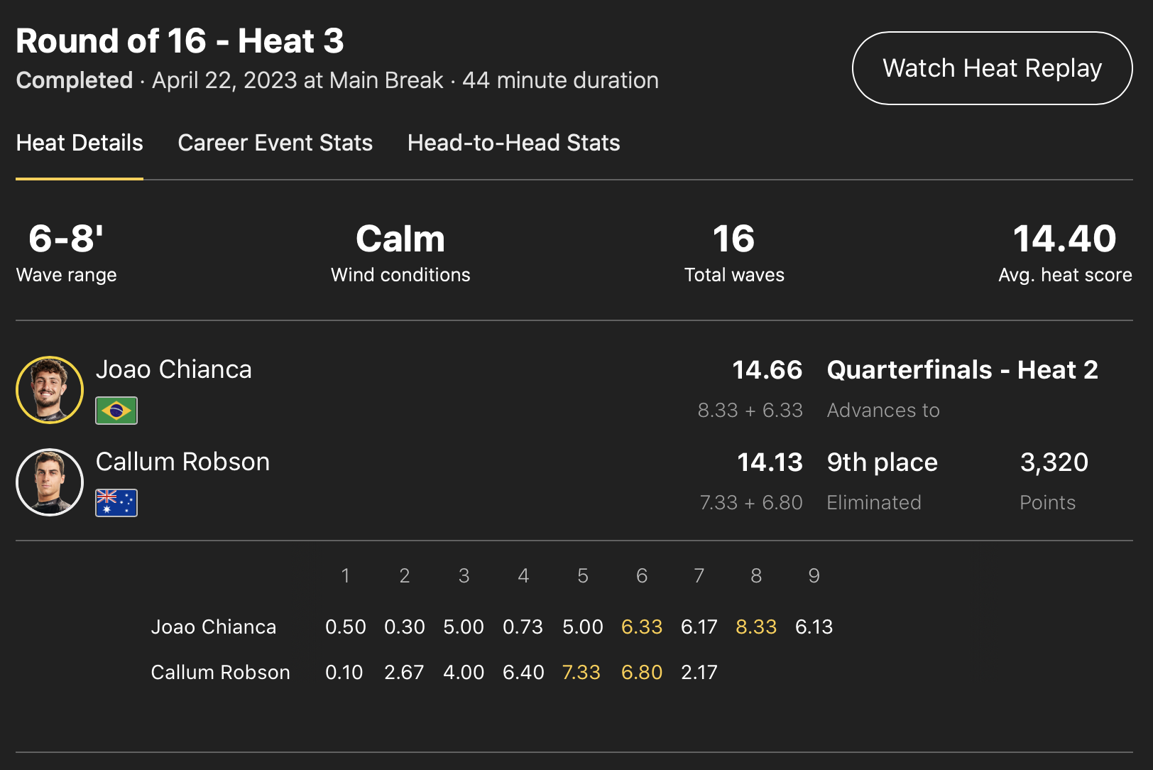 まずは現在CTランキングトップでありクォーターファイナルでConnor O’learyと対戦予定のJoao ChiancaがCallum Robsonを倒したラウンドオブ16のヒート3。