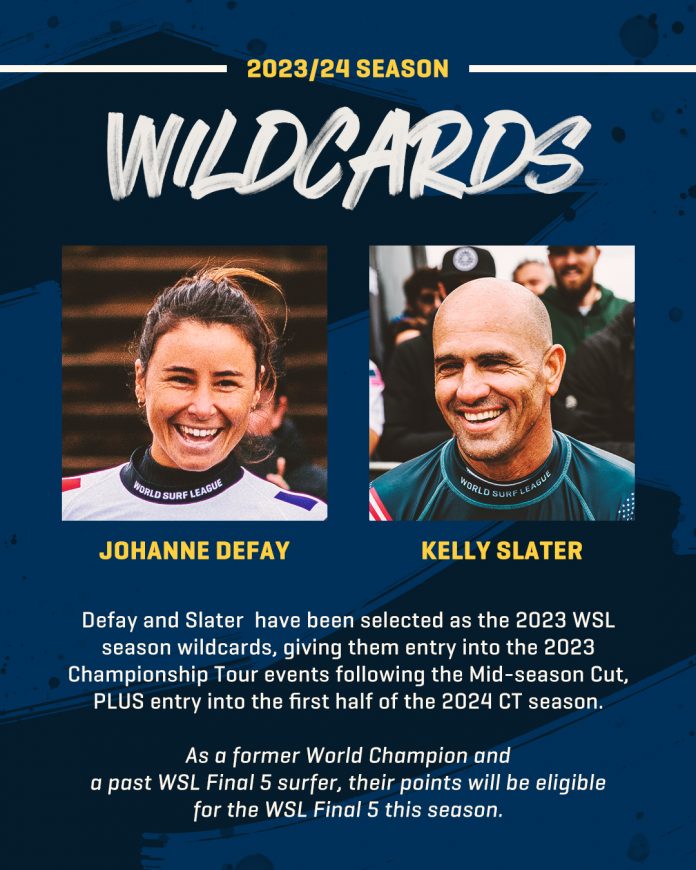 ミッドシーズンカットによって2023年CT後半戦への出場権を失ってしまったKelly SlaterとJohanna DefayがWSLシーズン・ワイルドカードで2023年CT後半戦と2024年CT前半戦までの出場権を獲得することが決定となった!