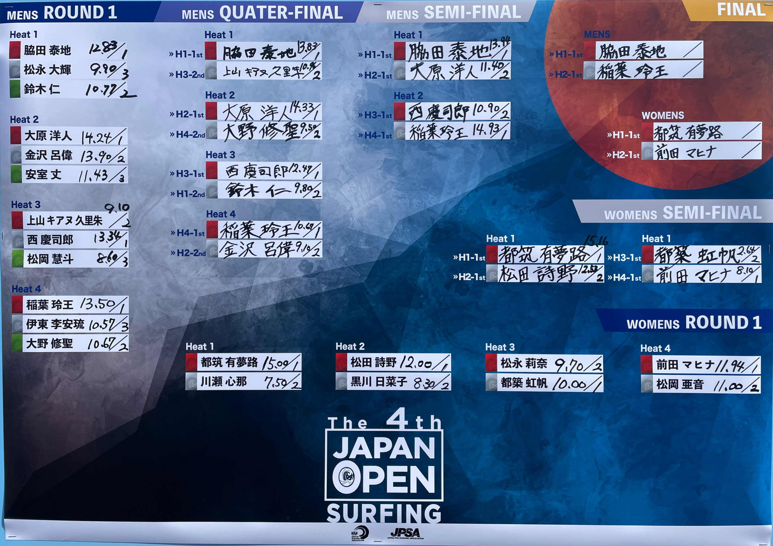 トッププロサーファーの中から招待選手男女総勢20名のみで行なわれ、深い歴史を持つ国内プロサーフィンツアーJPSAの年間グランドチャンプに次ぐ日本一のプロサーファー決定戦であり、2024年パリオリンピックの出場権を賭けたISA World Surfing Games日本代表枠を決定する非常に重要なこのビッグイベントでもある今大会は、それにふさわしい頭前後のオフショアというグッドコンディションの中で行なわれ、MENSは終了間際に大逆転劇を繰り広げた稲葉玲王が自身初となる優勝を飾り、WOMENSはCTサーファーとして活躍した経験を持つ日本人プロサーファー都筑有夢路が見事2年連続優勝を果たし、その圧倒的強さを見せ付けた!!