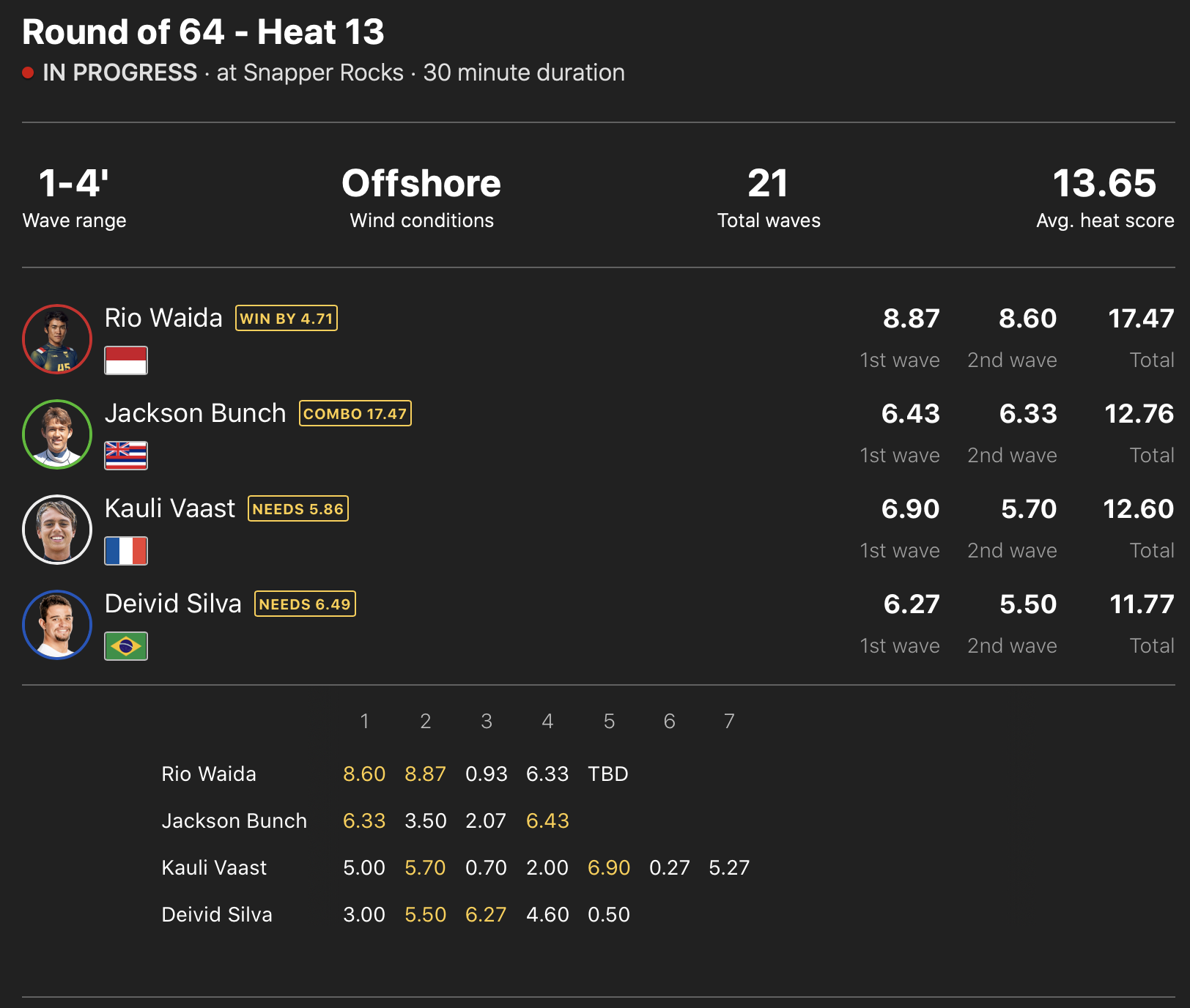 また、この日はWOMENSラウンドオブ32のヒート2で全スケジュールを終えたことから、コンテストDAY3は都築虹帆がSophia McCulloch、India Robinson、Silvana Limaと対戦するWOMENSラウンドオブ32のヒート3からスタートする事が予想される。