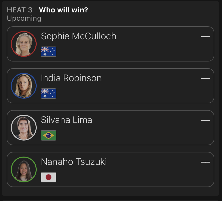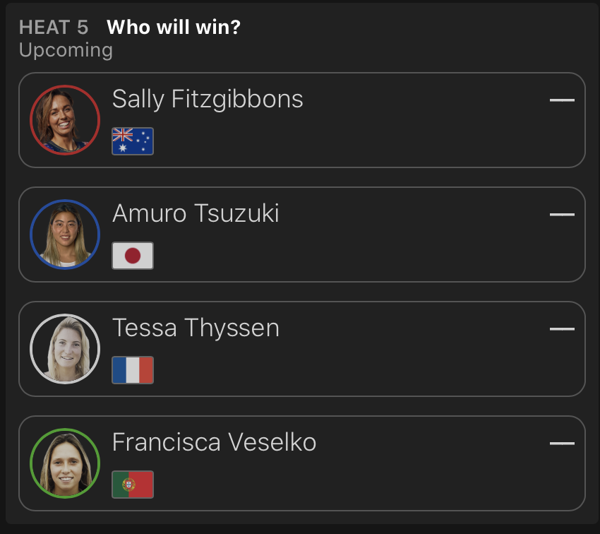 さらにヒート5では都筑有夢路がSally Fitzgibbons、Tessa Thyssen、Francisca Veselkoと対戦する予定となっている。
