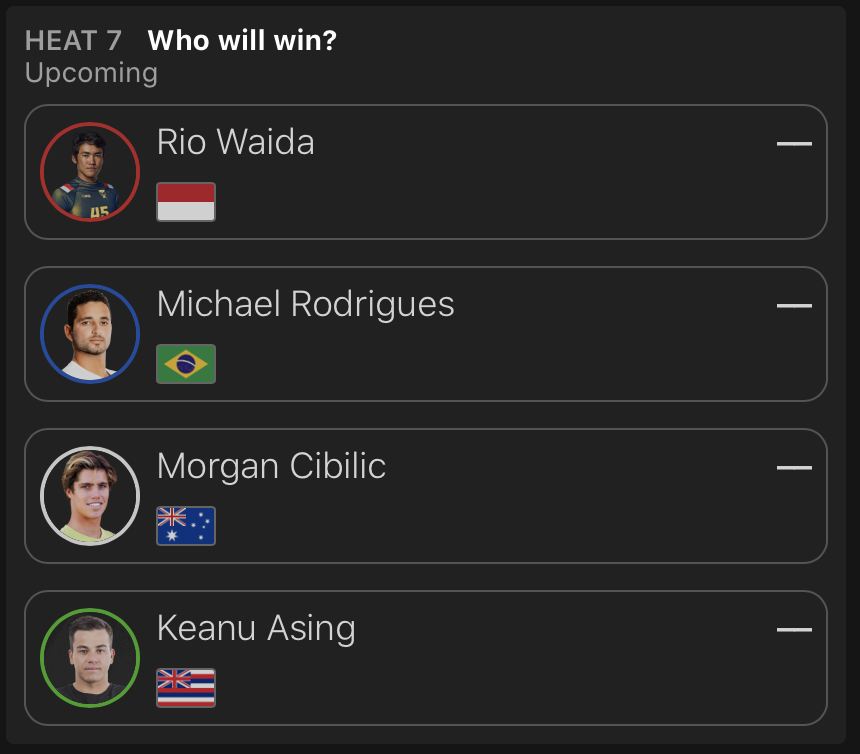 迎えるMENSラウンドオブ32では大原洋人がヒート1でプロジュニア世界チャンプのJarvis Earle、CTレベルのImai Kalani DeVault、Evan Geiselmanと対戦予定。