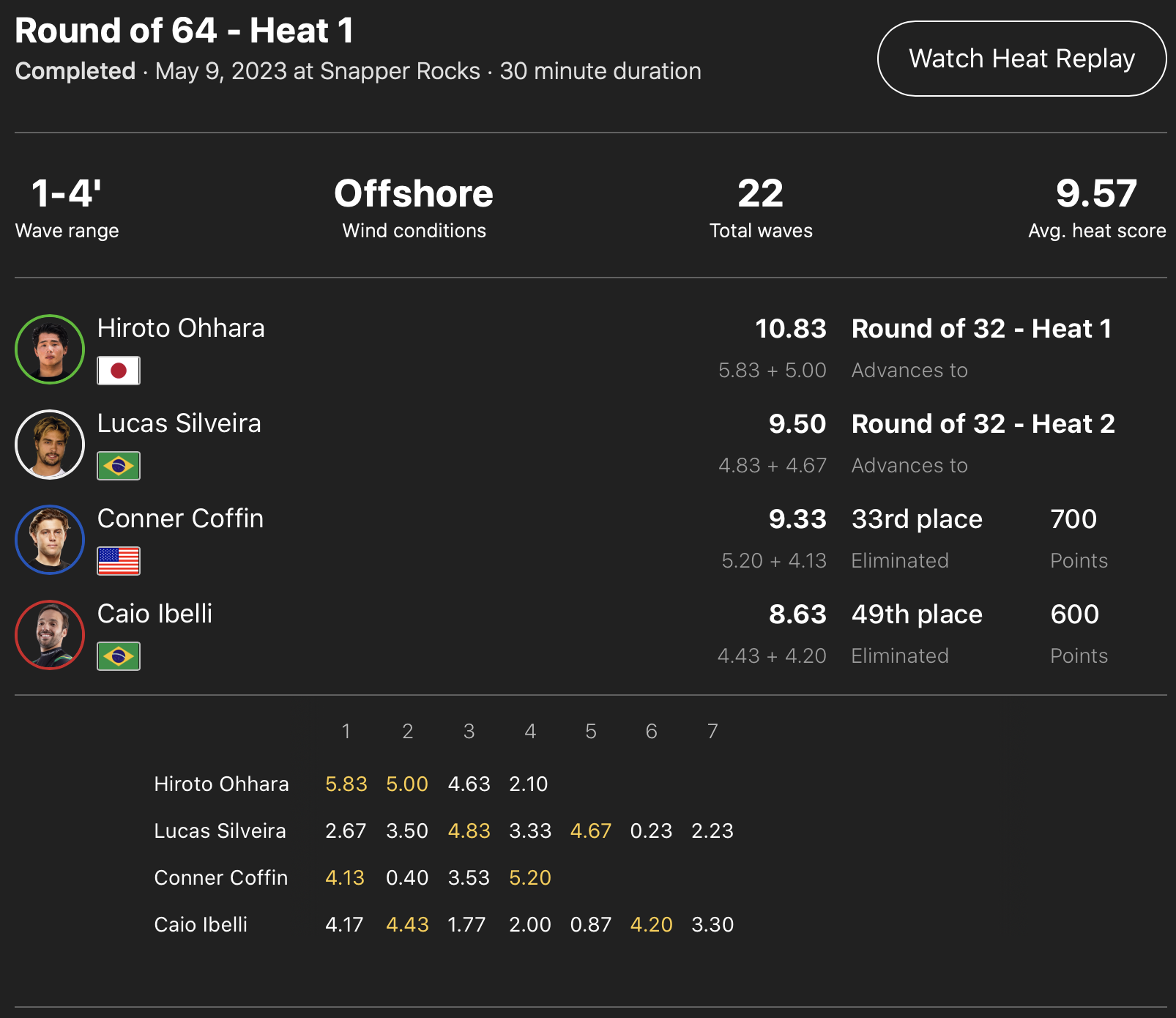注目の大原洋人はラウンドオブ64のヒート1でCaio Ibelli、Conner Coffin、Lucas Silveiraと対戦。