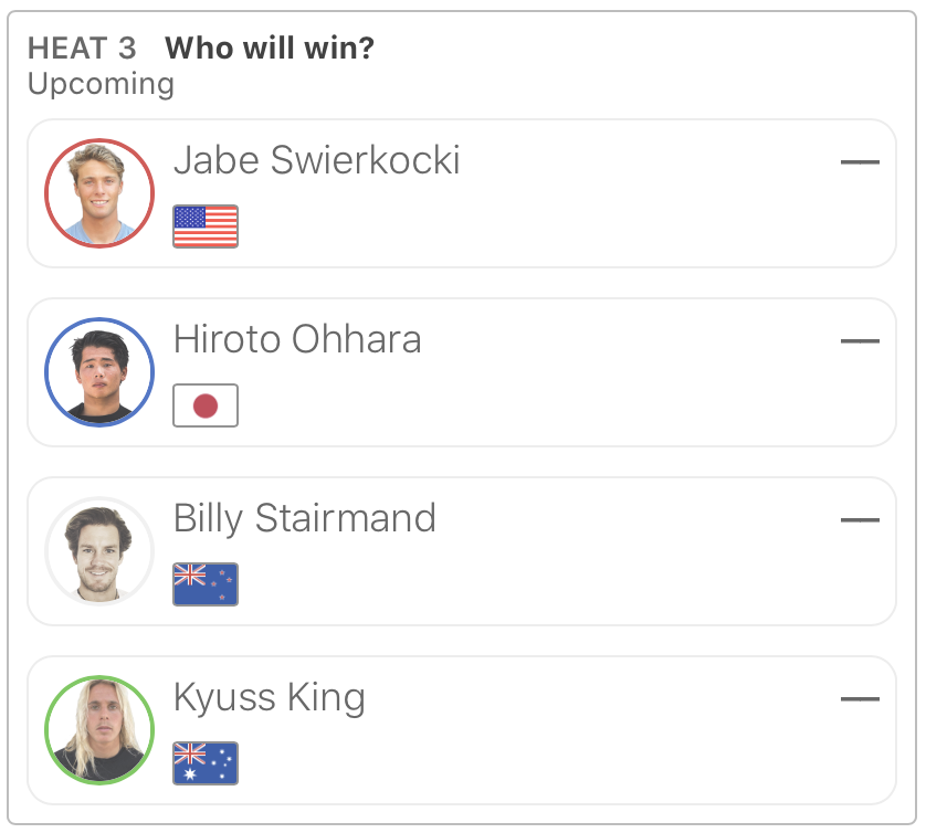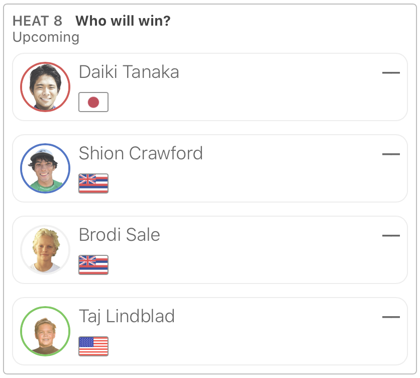 注目の日本人選手は、MENSラウンドオブ80のヒート3に大原洋人が、ヒート8に田中大貴が出場。