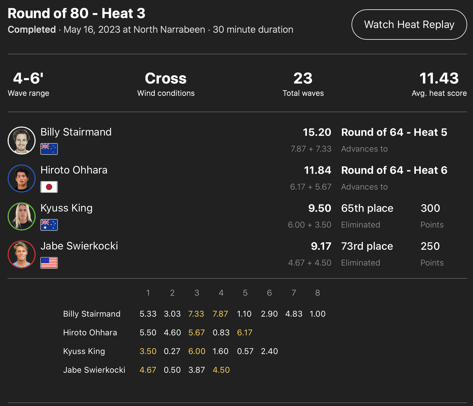 注目の日本人選手たちの活躍は、ヒート3の大原洋人が良い波が少ない中でも3本目に5.67pt、5本目に6.17ptをまとめ、この日のハイエスト・シングルスコアをマークしたBilly Stairmandに次ぐ2位のポジションでラウンドオブ64へ進出!