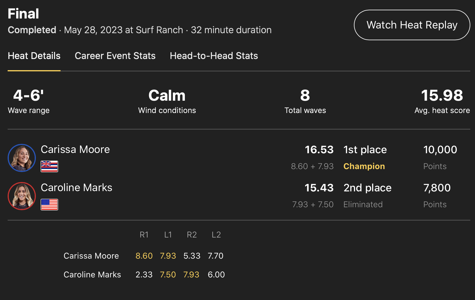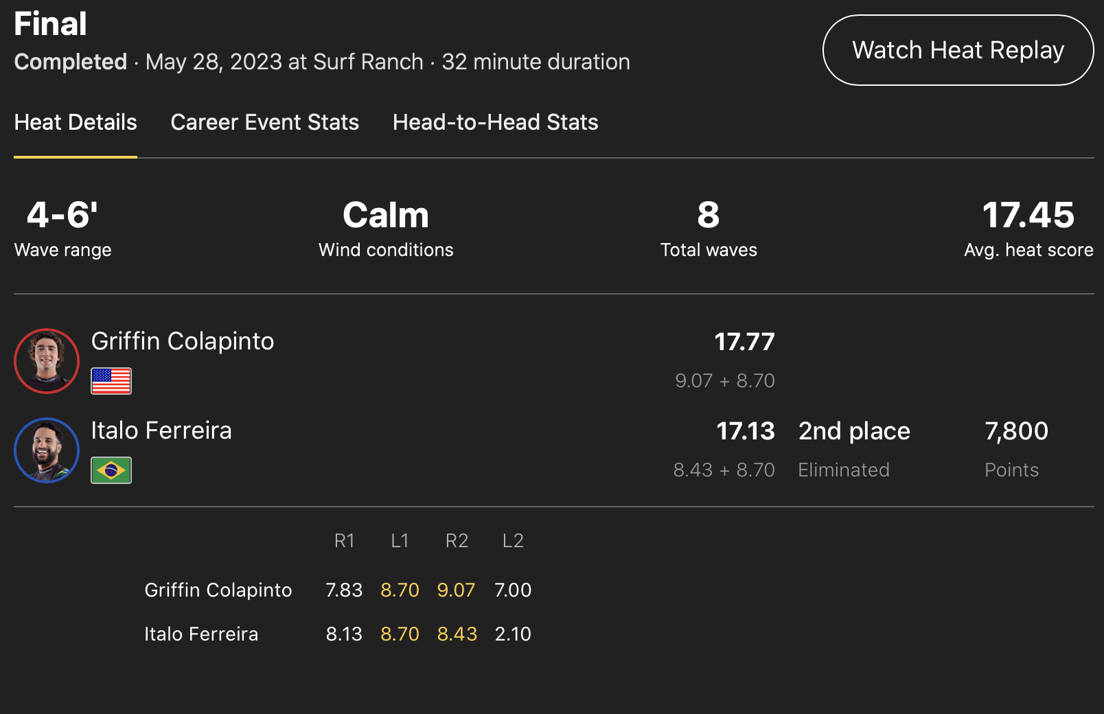 注目の日本人選手たちは、昨日お伝えした通りナイトセッションで敗退となり、五十嵐カノアとConnor O’learyが9位、和井田理央が17位で今大会を終えた。