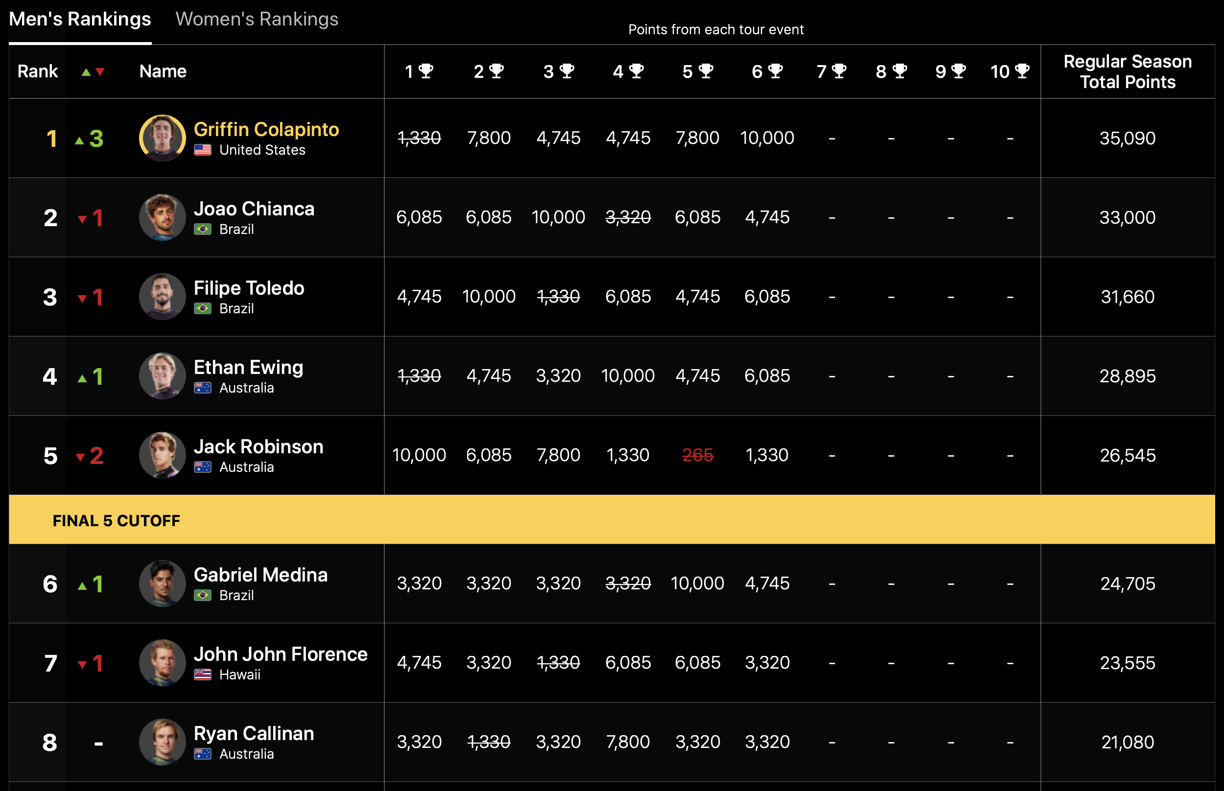 今大会で優勝を果たしたGriffin ColapintoとCarissa MooreはCTランキング1位へジャンプアップ!!
